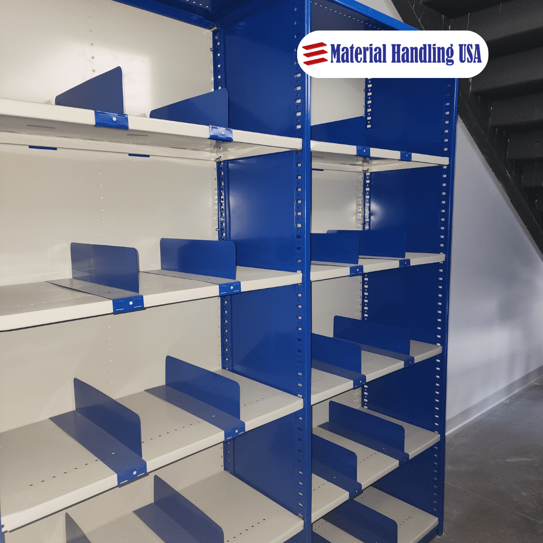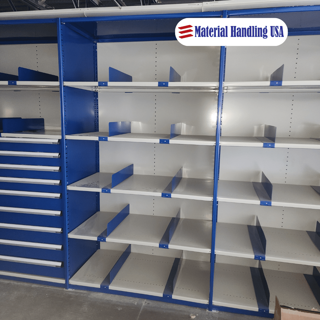 Options include shelving, drawer systems, cabinets, bins, and racks specifically designed to hold various parts securely and neatly.