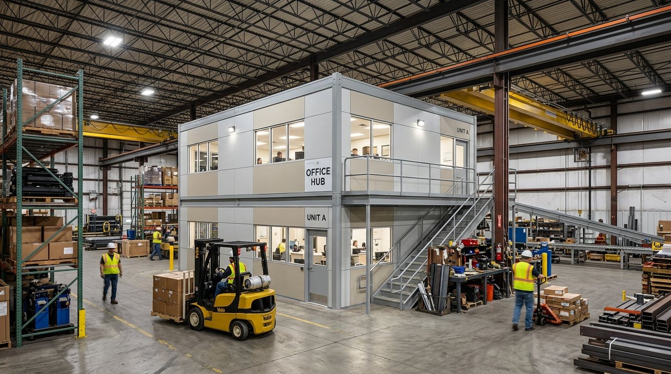 Yes. Modular office buildings can be placed on mezzanine platforms to create elevated workspaces. This is a common configuration that combines the space-doubling benefit of a mezzanine with the enclosed environment of a modular office.
