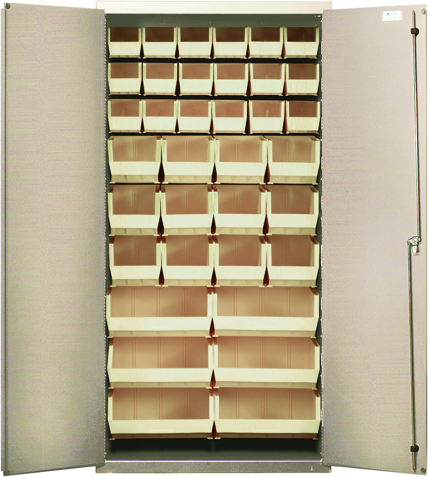 Heavy-Duty 36″ Bin Cabinet, 36″W x 18″D x 72″H, 14 gauge all welded construction, includes: (18) QUS230, (12) QUS240 and (6) QUS250 ivory bins, beige powder-coated finish