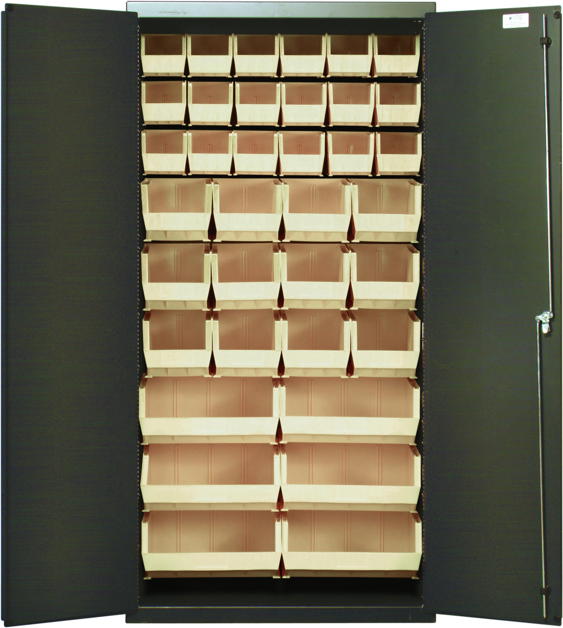 Heavy-Duty 36″ Bin Cabinet, 36″W x 18″D x 72″H, 14 gauge all welded construction, includes: (18) QUS230, (12) QUS240 and (6) QUS250 ivory bins, gray powder-coated finish