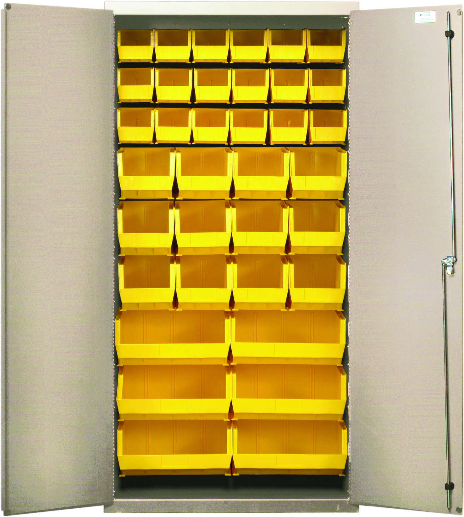 Heavy-Duty 36″ Bin Cabinet, 36″W x 18″D x 72″H, 14 gauge all welded construction, includes: (18) QUS230, (12) QUS240 and (6) QUS250 yellow bins, beige powder-coated finish
