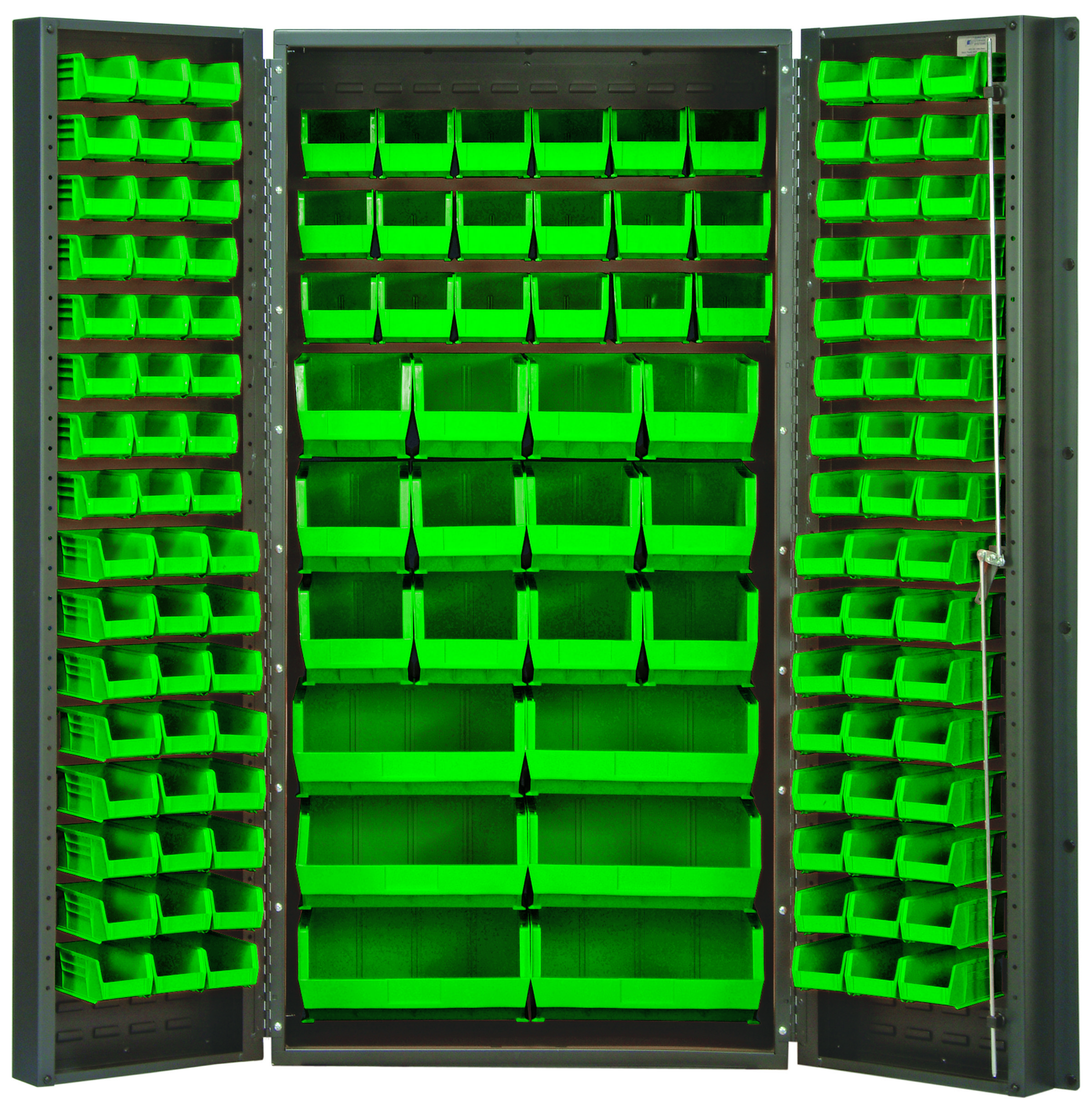 Quantum Heavy-Duty 36″ Bin Cabinet, 36″W X 24″D X 72″H, 14 Gauge All Welded Construction, Includes: (48) QUS210, (48) QUS220, (18) QUS230, (12) QUS240 And (6) QUS250 Green Bins, Gray Powder-Coated Finish