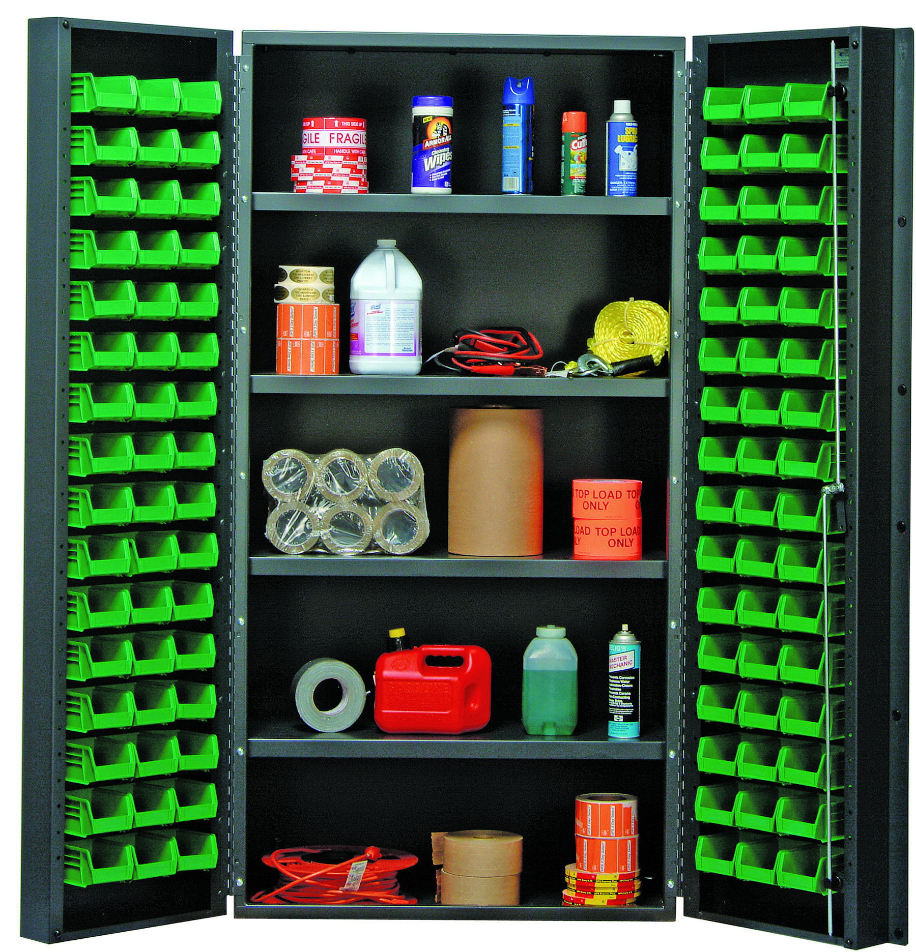 Quantum Heavy-Duty 36″ Bin Cabinet, 36″W X 24″D X 72″H, 800 Lb. Capacity Per Interior Shelf, 14 Gauge All Welded Construction, Includes: (32) QUS232 Green Bins, Gray Powder-Coated Finish
