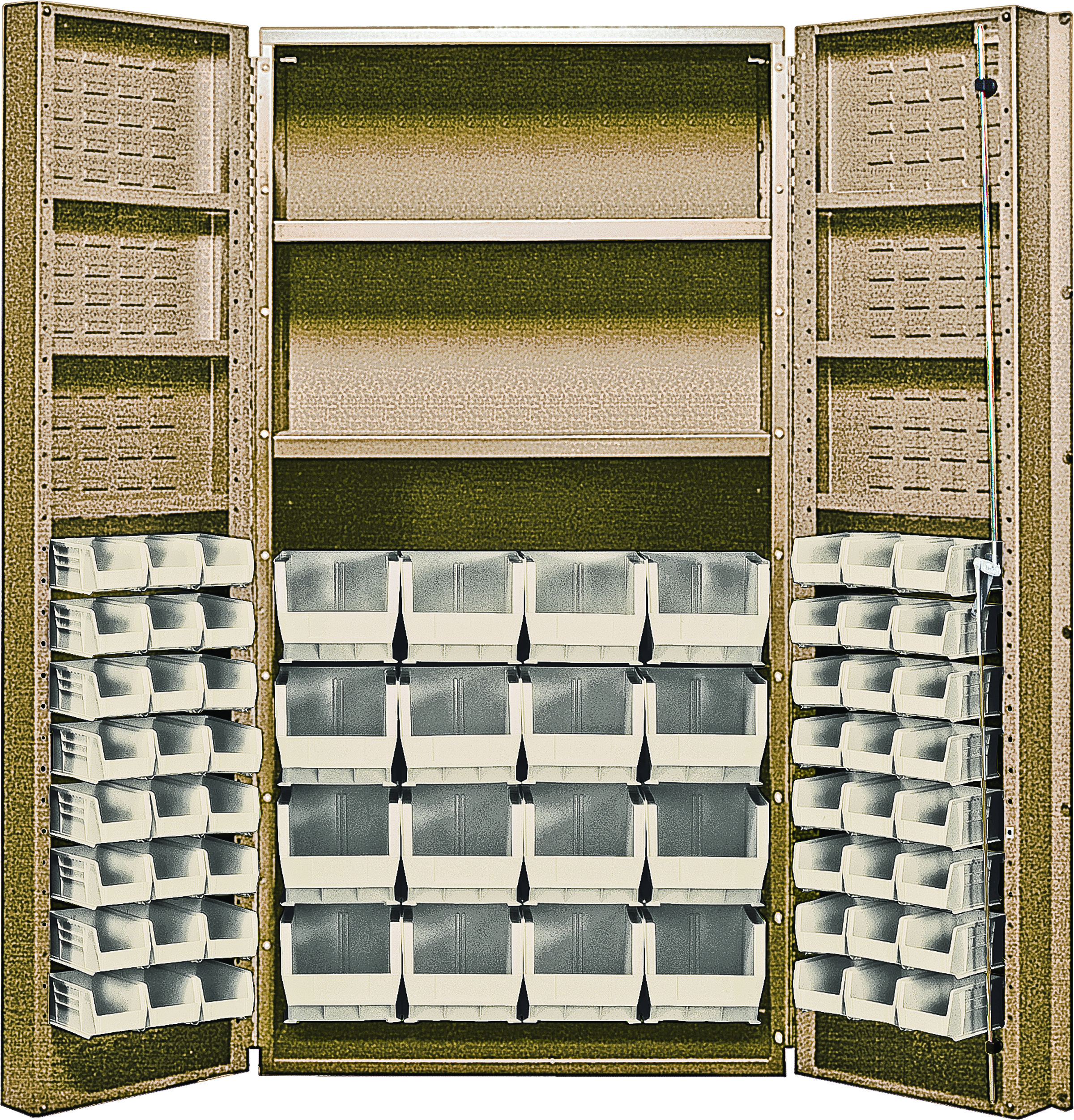 Heavy-Duty 36″ Bin Cabinet, 36″W x 24″D x 72″H, 800 lb. capacity per interior shelf and 60 lb. capacity per foor shelf, 14 gauge all welded construction, includes: (16) QUS236 and (16) QUS240 ivory bins, beige powder-coated finish