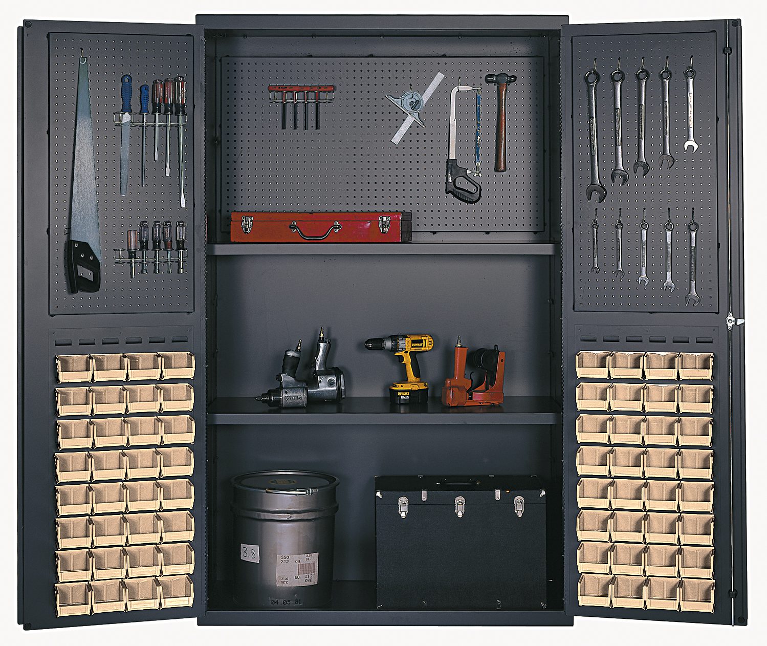Heavy-Duty 48″ Bin Cabinet, 48″W x 24″D x 78″H, 400 lb. capacity per interior shelf, 14 gauge all welded construction, includes: (2) adjustable shelves, punched panels on inside rear wall and doors and (64) QUS210 ivory bins, gray powder-coated finish