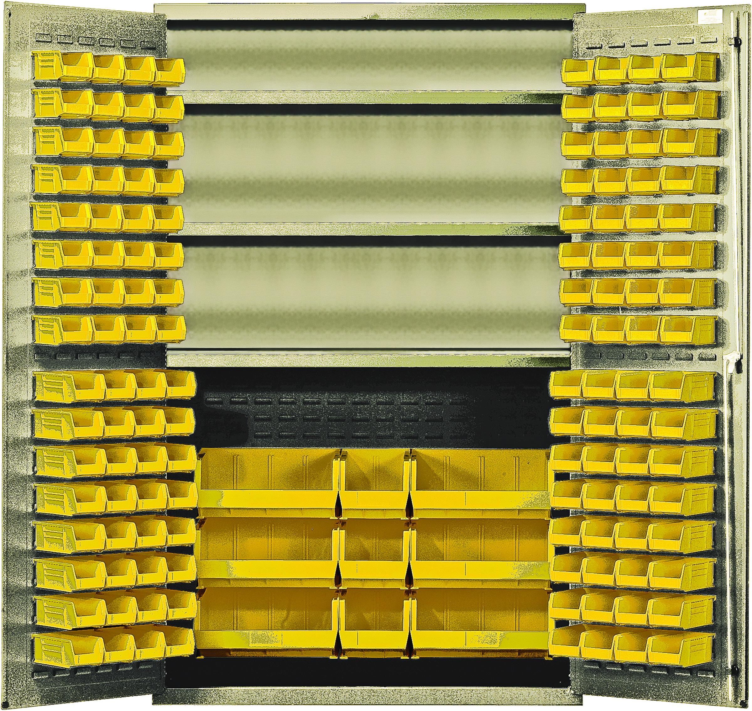 Heavy-Duty 48″ Bin Cabinet, 48″W x 24″D x 78″H, 400 lb. capacity per interior shelf, 14 gauge all welded construction, includes: (3) adjustable shelves, (64) QUS210, (64) QUS220, (3) QUS240 and (6) QUS250 yellow bins, beige powder-coated finish