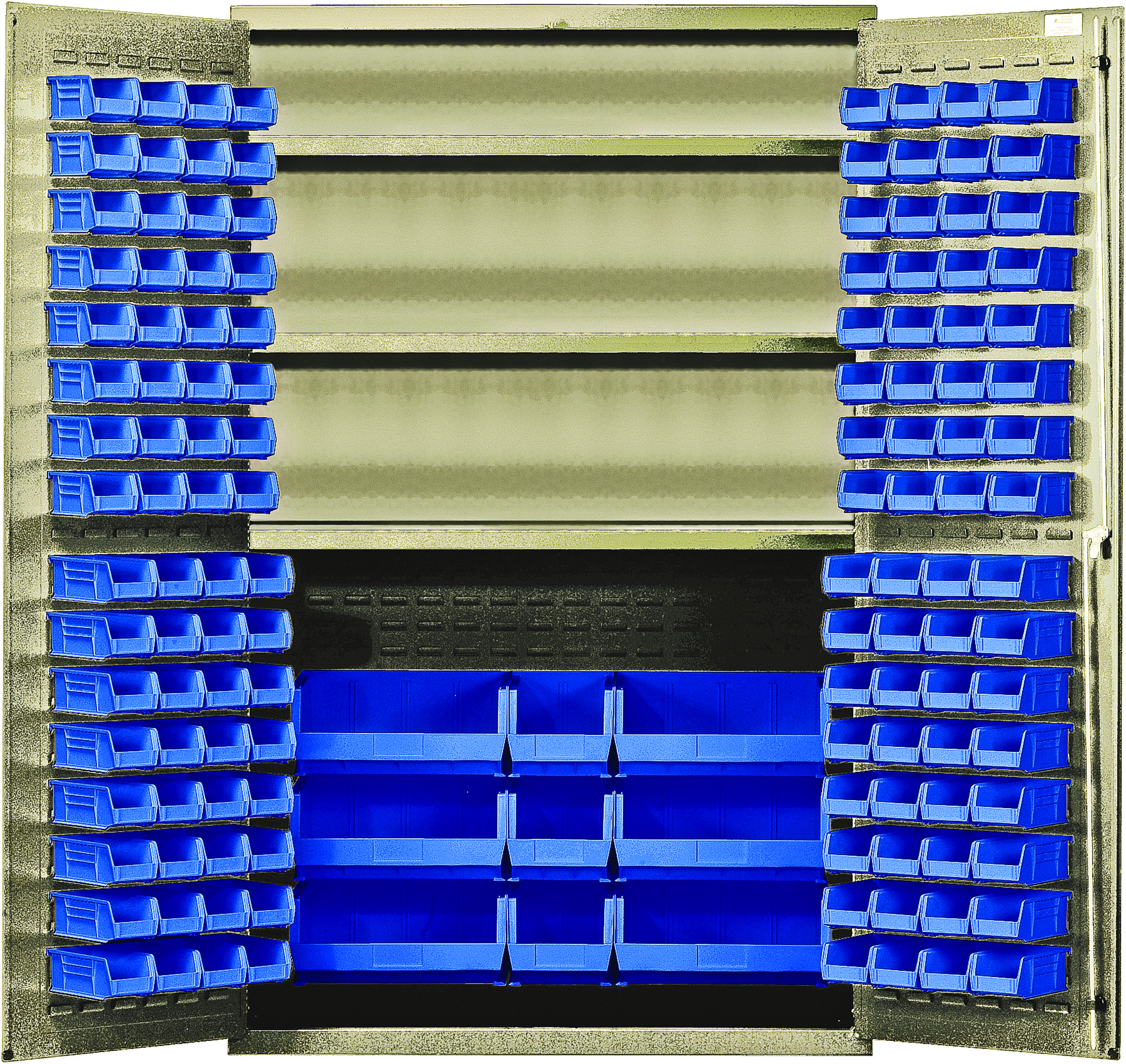 -58%Heavy-Duty 48″ Bin Cabinet, 48″W x 24″D x 78″H, 400 lb. capacity per interior shelf, 14 gauge all welded construction, includes: (3) adjustable shelves, (64) QUS210, (64) QUS220, (3) QUS240 and (6) QUS250 blue bins, beige powder-coated finish