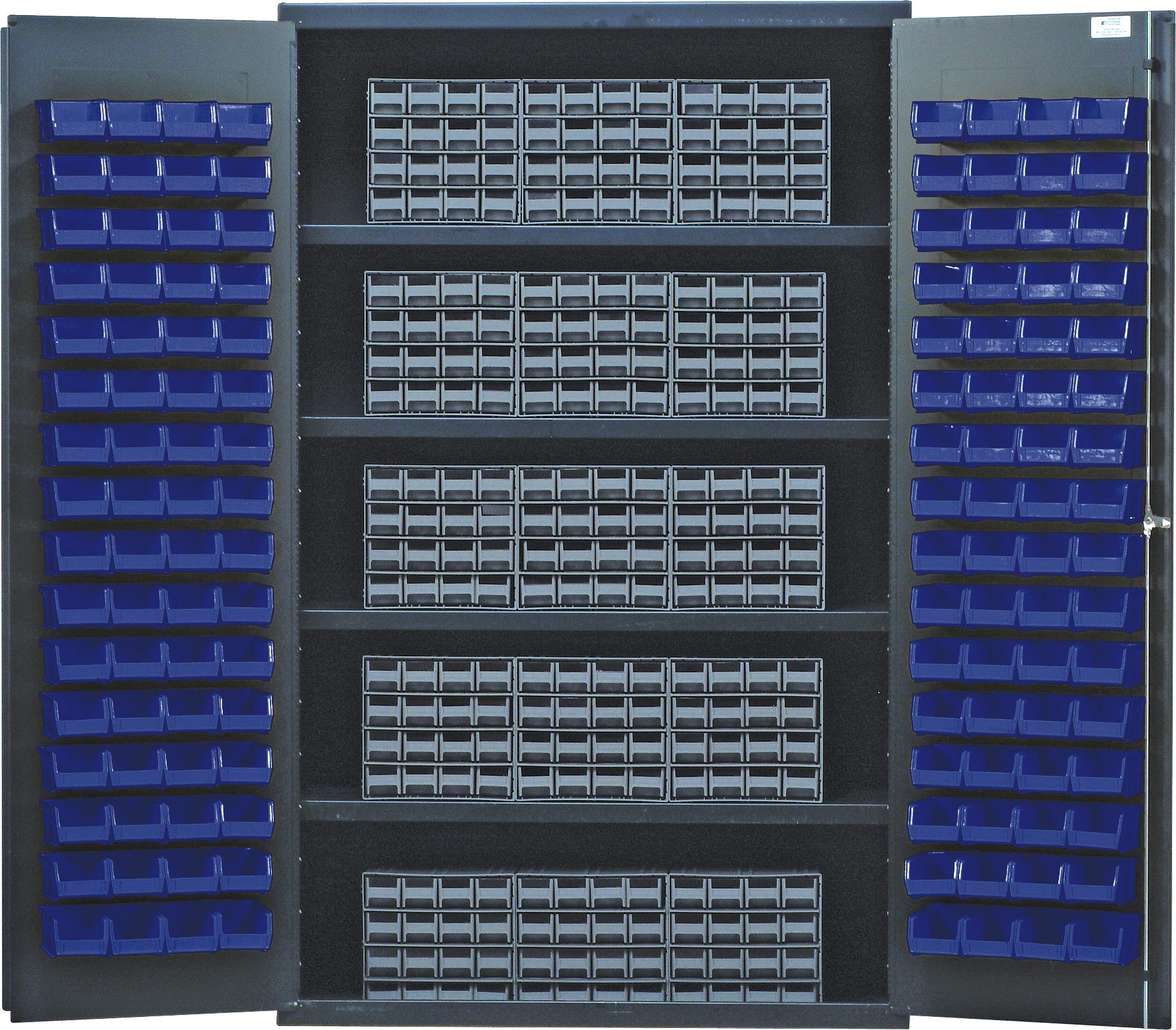 Heavy-Duty 48″ Bin Cabinet, interlocking drawer storage, 48″W x 24″D x 78″H, 400 lb. load capacity per shelf, 14 gauge all welded construction, includes: (4) shelves, (15) QIC-161 gray interlocking drawers and (128) QUS210 blue bins, gray powder-coated finish