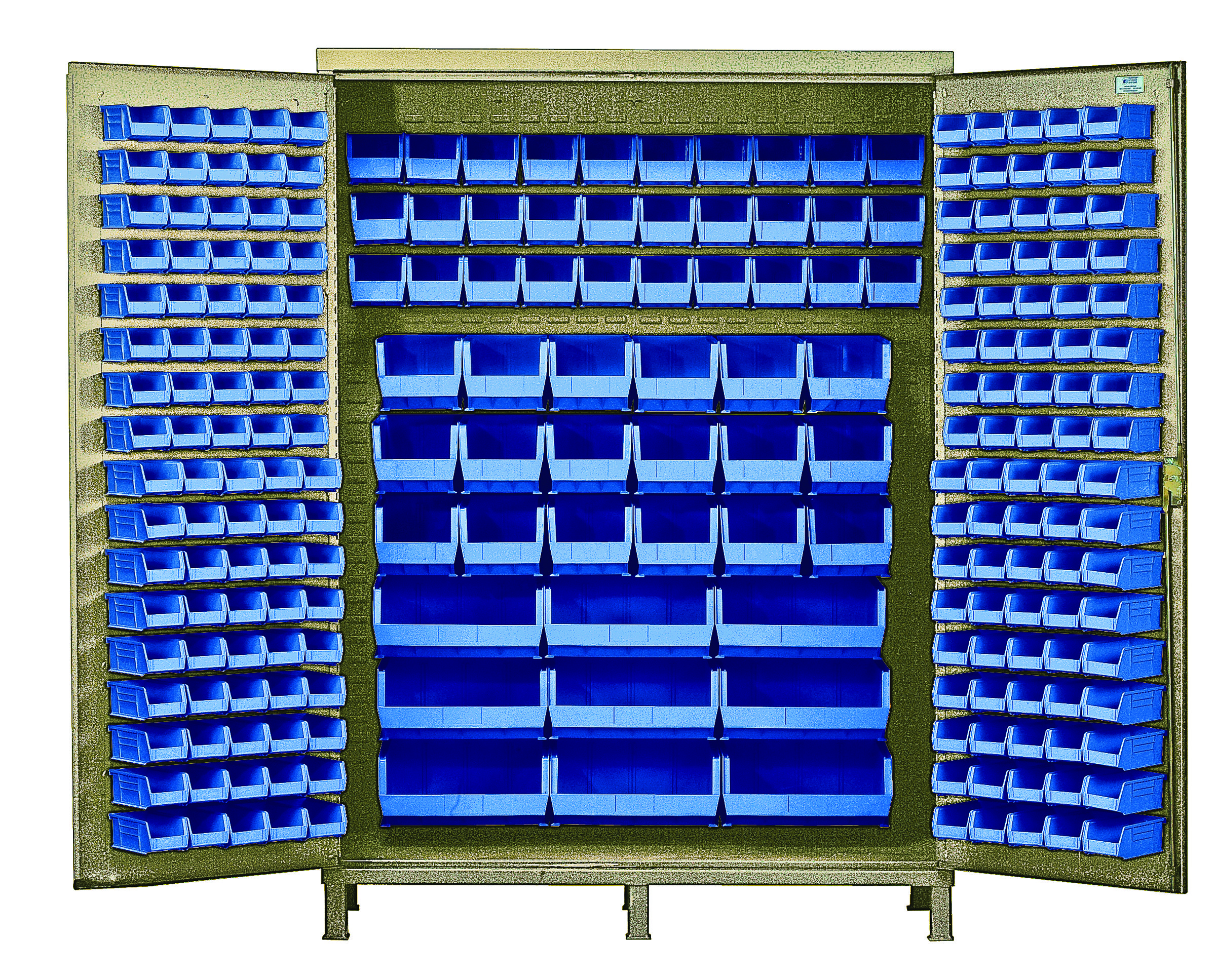 Heavy-Duty 60″ Bin Cabinet, 60″W x 24″D x 84″H, 14 gauge all welded construction, includes: (80) QUS210, (90) QUS220, (30) QUS230, (18) QUS240 and (9) QUS250 blue bins, beige powder-coated finish
