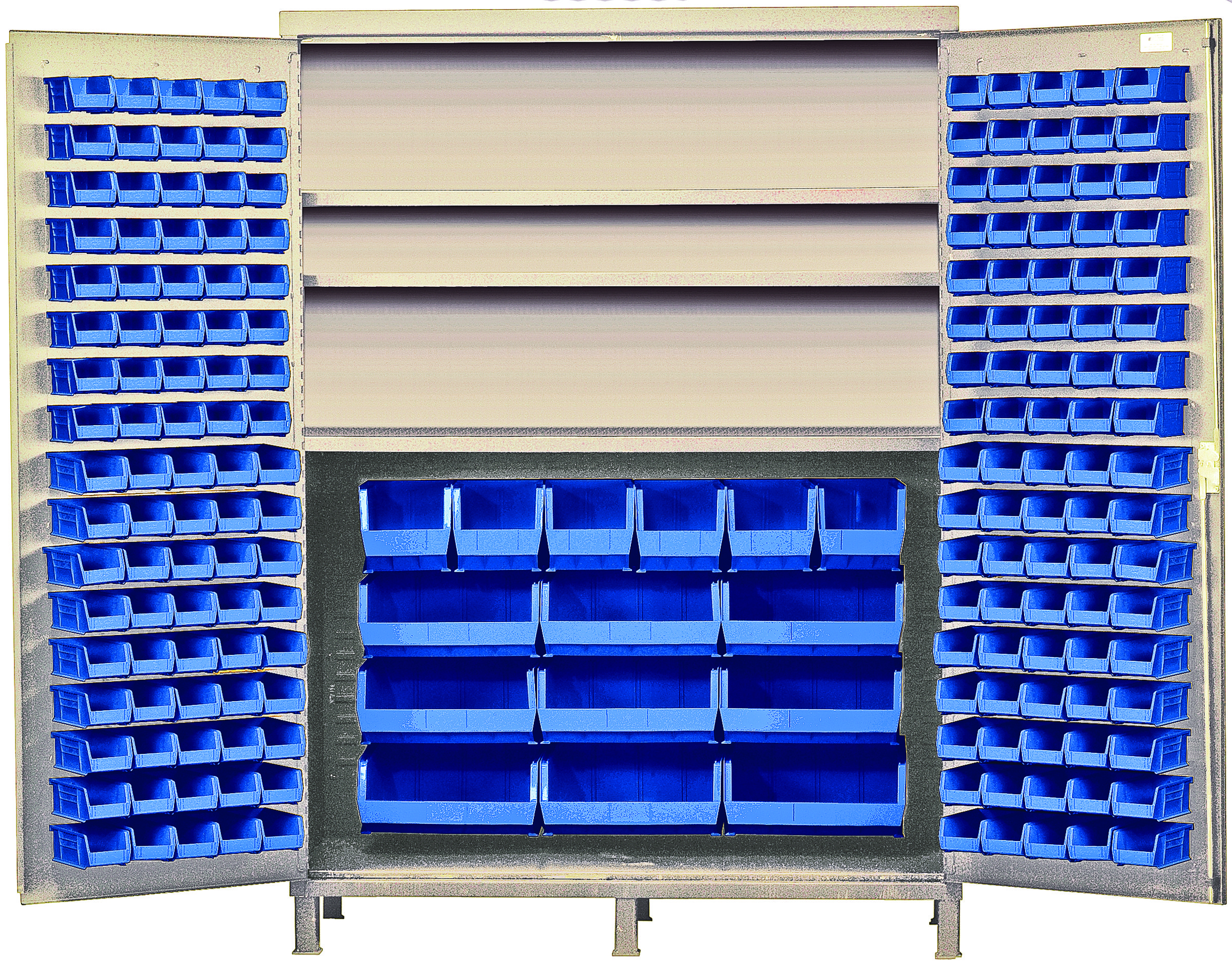 Heavy-Duty 60″ Bin Cabinet, 60″W x 24″D x 84″H, 500 lb. capacity per interior shelf, 14 gauge all welded construction, includes: (3) adjustable shelves, (80) QUS210, (90) QUS220, (6) QUS240 and (9) QUS250 blue bins, beige powder-coated finish