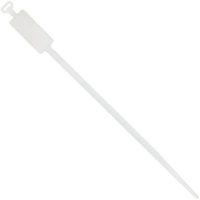 The MH-USA 7 Identification Cable Ties (1000/Case) are white plastic ties featuring a rectangular label tag for easy fastening and labeling, with an elongated pointed end for effortless insertion.