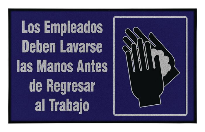 The Justrite Mat,194 Span Employee Wash 3X5 includes a blue and black sign with Spanish text: Los Empleados Deben Lavarse las Manos Antes de Regresar al Trabajo, alongside an icon of hands with soap, promoting workplace hygiene.