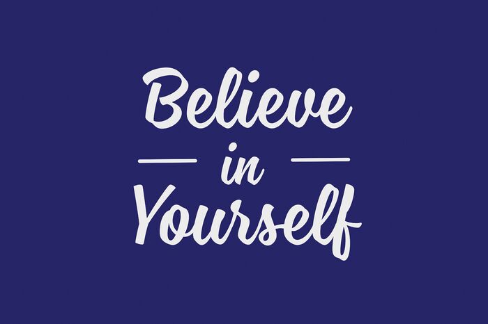 The image displays a dark blue background with inspirational white text, Believe in Yourself, in bold cursive. This Justrite Mat,195 Believe In Self 4X6 Bu design promotes self-belief and empowerment.