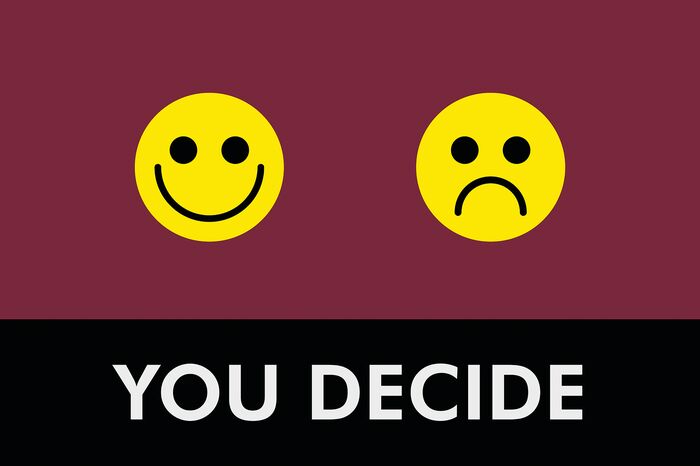 Two yellow smiley faces on a maroon background adorn the Justrite Mat (195 You Decide 4X6 Rd); the left face smiles joyfully, and the right frowns. Below is a black bar with YOU DECIDE in bold white capital letters, mirroring its distinctive design.