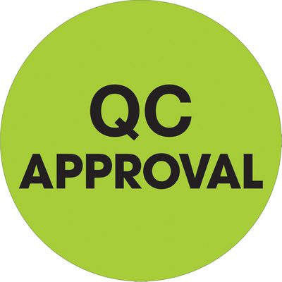 A vibrant circular badge, like the MH-USA 2 Circle - QC Approval Fluorescent Green Labels, prominently features QC APPROVAL in bold black text.