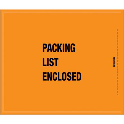 Pressure sensitive packing list envelopes secure and protect documents that are attached to the outside of shipments. Full face, fluorescent orange Packing List Envelopes are pre-printed with “Packing List Enclosed” on heavy 2 Mil poly.