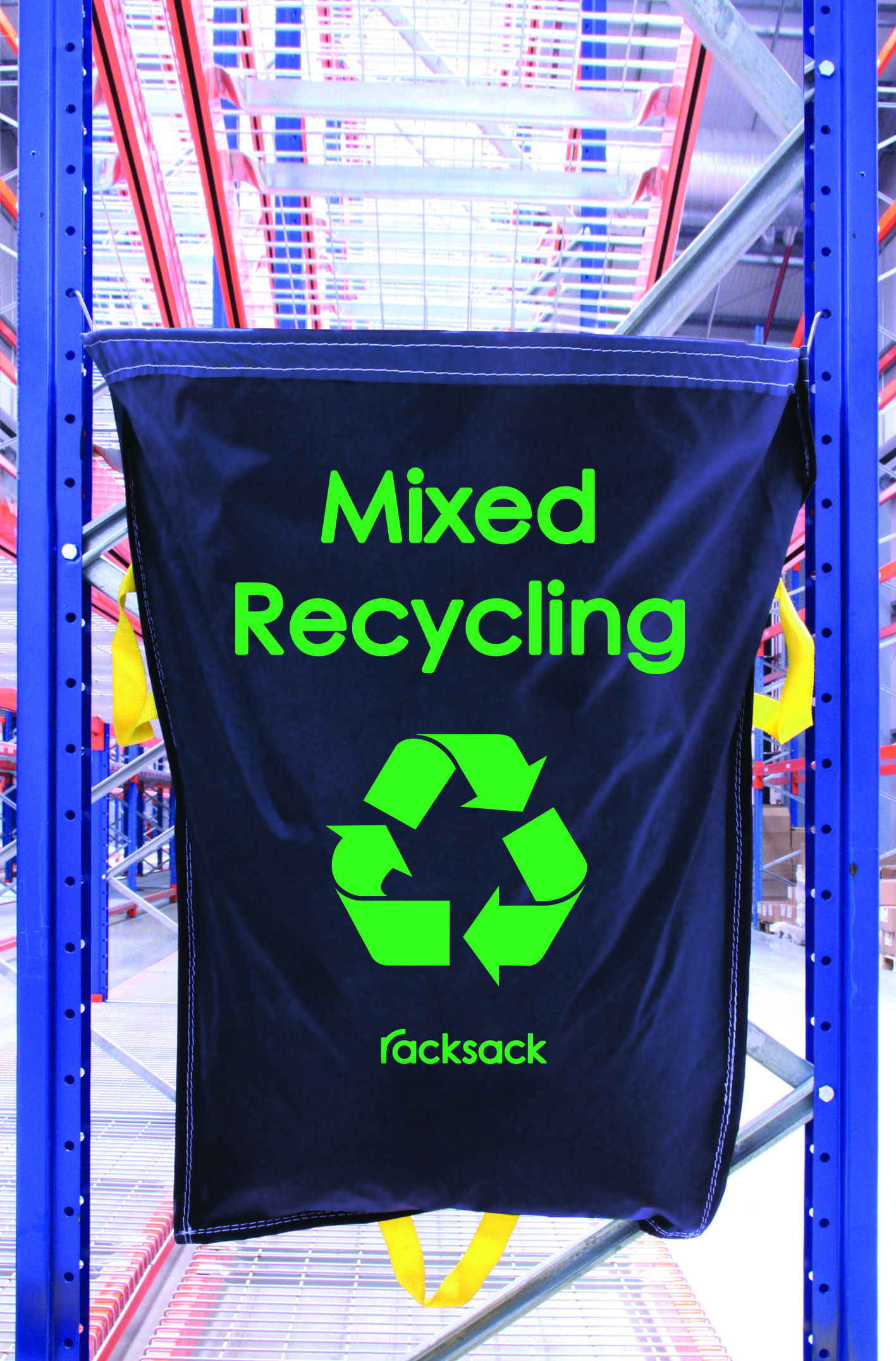 Waste management problems are easily solved with the racksack. Ideal for most warehouse racking systems, the racksack quickly fixes to the end of your racking frame. The racksack is designed for most racking and shelving systems between 35.43 in. and 43.31 in.. Once full, racksacks can be removed and emptied with ease. The racksack has been thoughtfully developed so that it will not intrude into valuable warehouse space. When hung it has a large open mouth to easily receive waste, yet its tapered design enables it to hardly encroach into the floor area. Originally designed for the warehouse the racksack’s flexible method of ‘S’ locator fixing means it can be hung over or hooked onto any substrate. That’s why the racksack has quickly established itself a place in other industrial areas such as factories, offices or anywhere where waste has become a problem. Made from tough waterproof polyester the racksack can adequately withstand the rigours of an industrial environment. Three strong handles are woven into the edge of the sack, one on each side for carrying and one on the base, so that