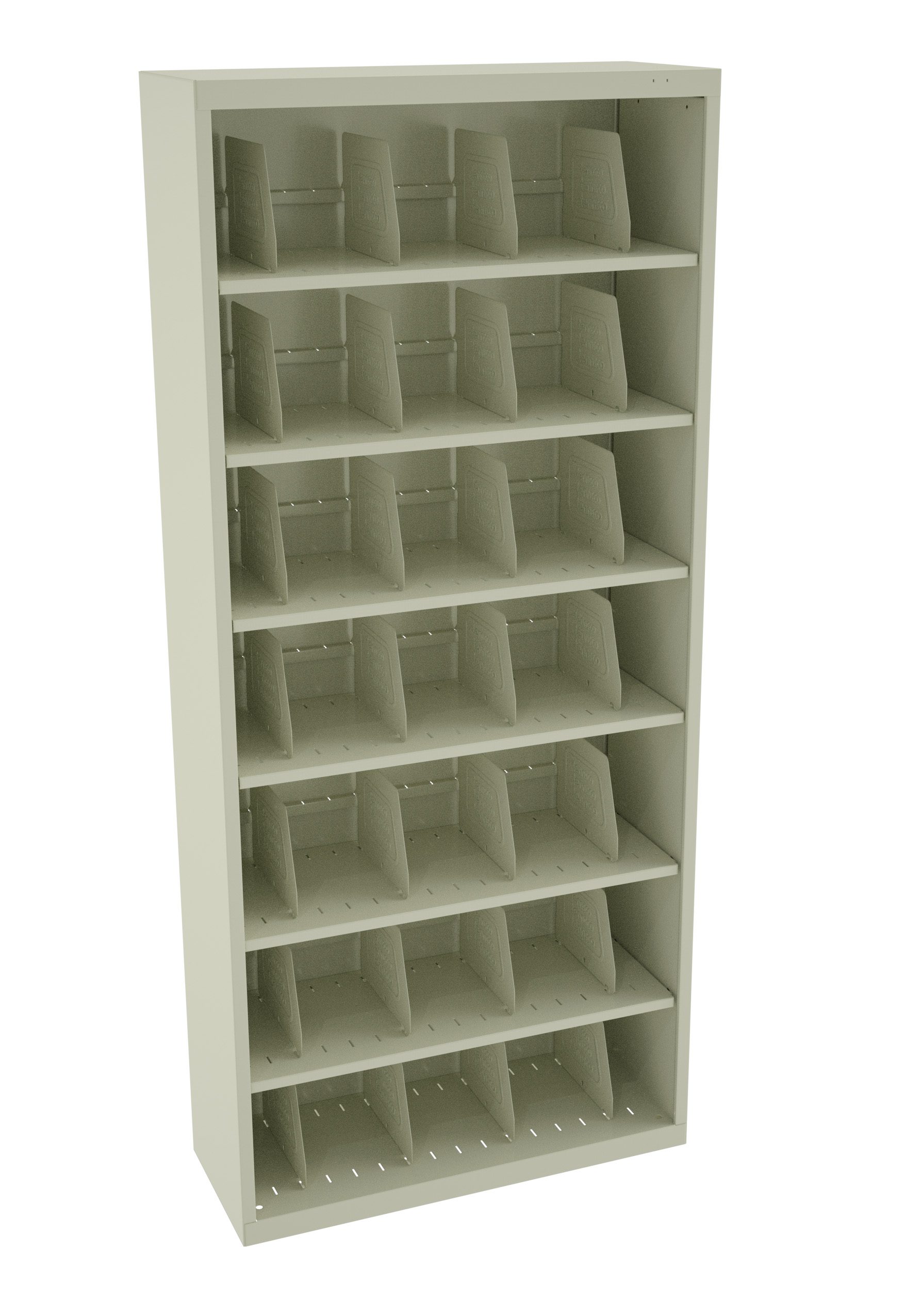 A tall, beige shelving unit with seven shelves, each divided into four compartments. The unit is empty and stands against a plain white background.