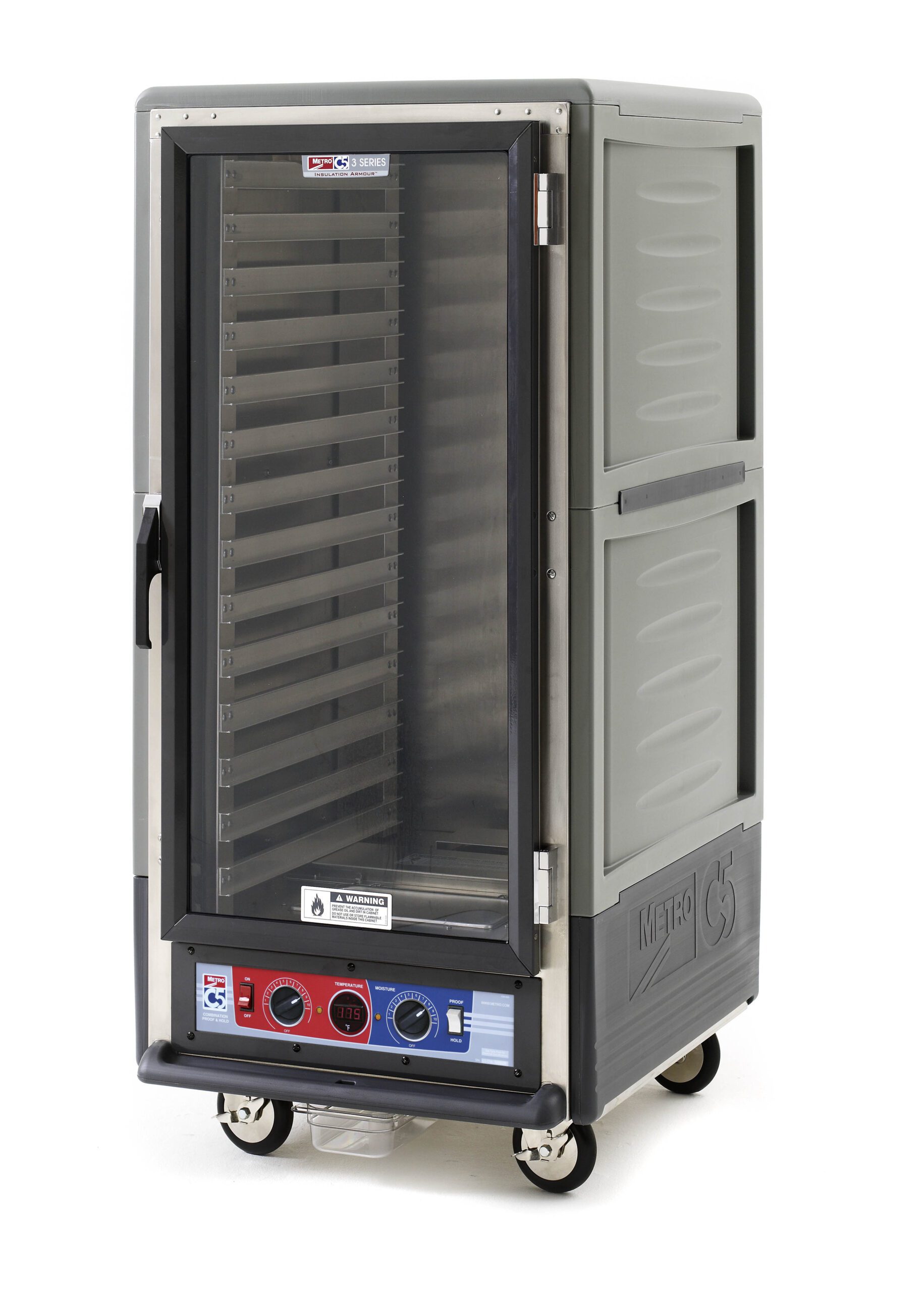 Introducing the Metro 3/4 Height Insulated Holding/Proofing Cabinet with a full-length clear door. This cabinet is designed for energy efficiency with a cool-to-touch exterior, ensuring a lower initial investment for your business. The cabinet features a Durable Polymer Insulation Armour that is resistant to dents, impacts, and stains, providing long-lasting reliability.