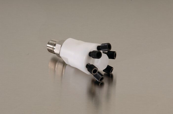 HPLC Poly Manifold with S/S Stacker Connector for up to 12 waste lines into a Safety Disposal Can.