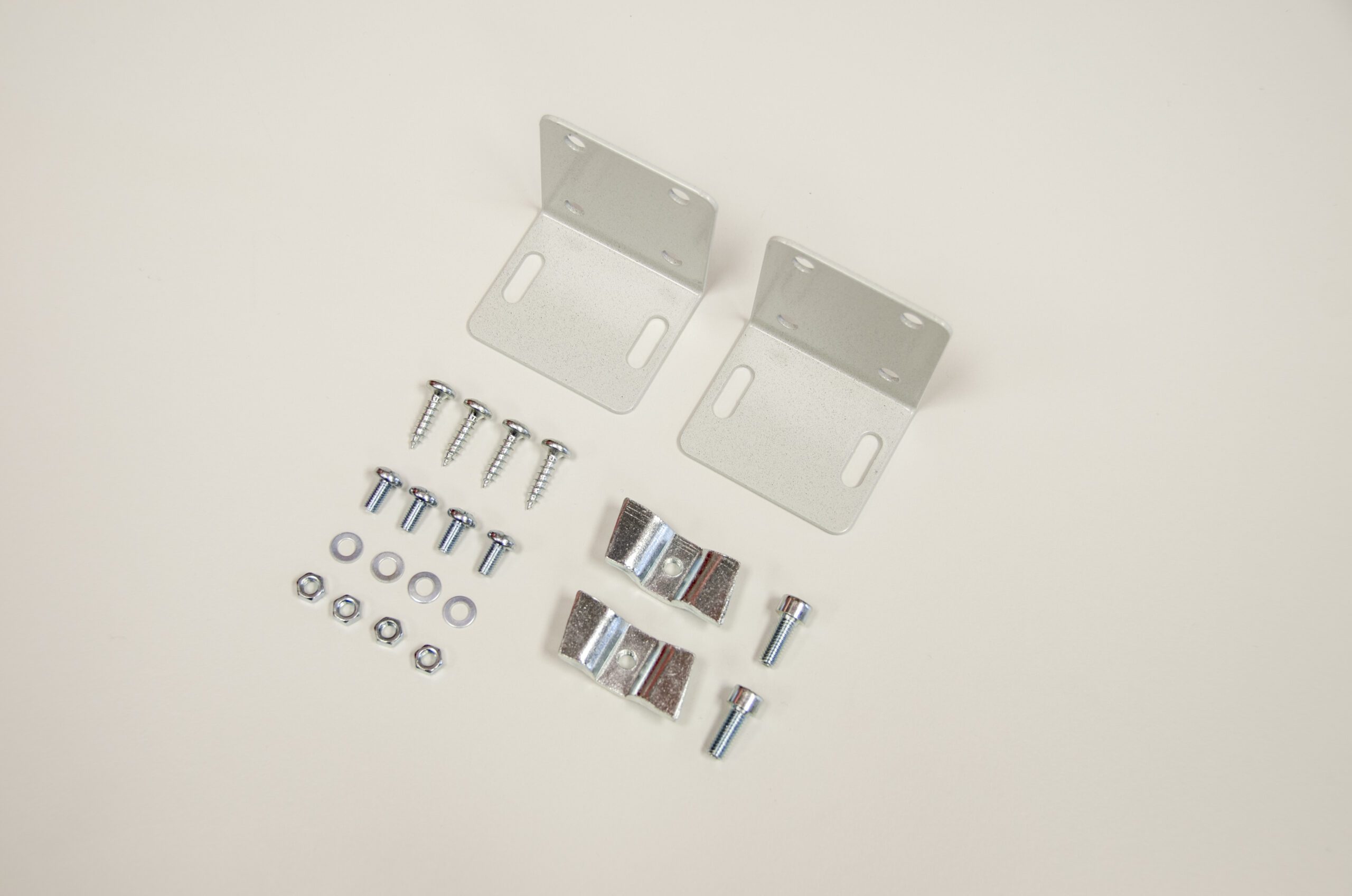 Two silver metal brackets with screw holes, eight screws, eight nuts, four washers, two metal clips, and two bolts are arranged on a plain white surface.