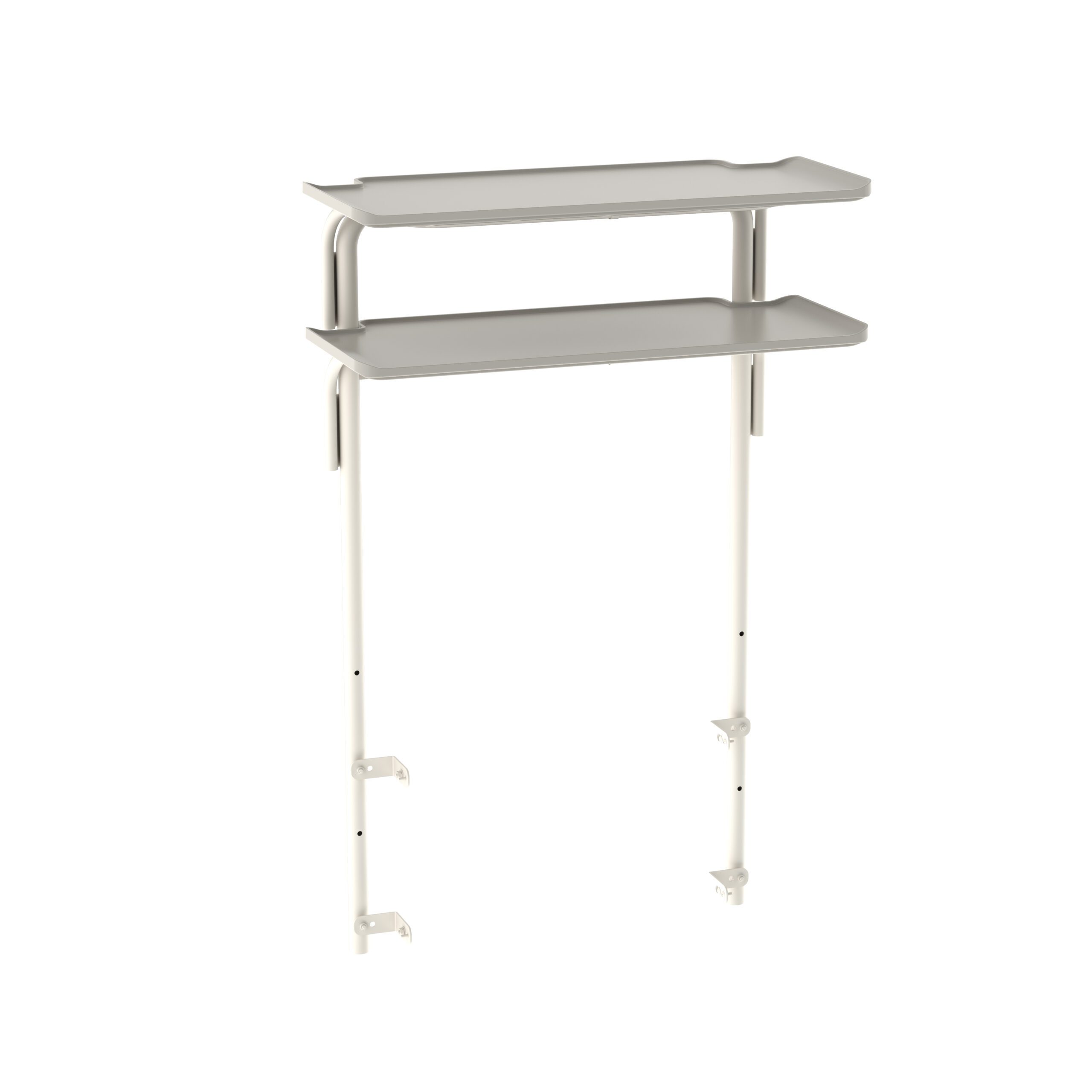 Introducing the Metro FL520 Flexline Overbridge with 2 Shelves, a minimalist wall-mounted desk featuring sleek gray shelves and stylish white metal supports. Its space-saving design includes an upper shelf thats slightly wider, adding elegance to any room.