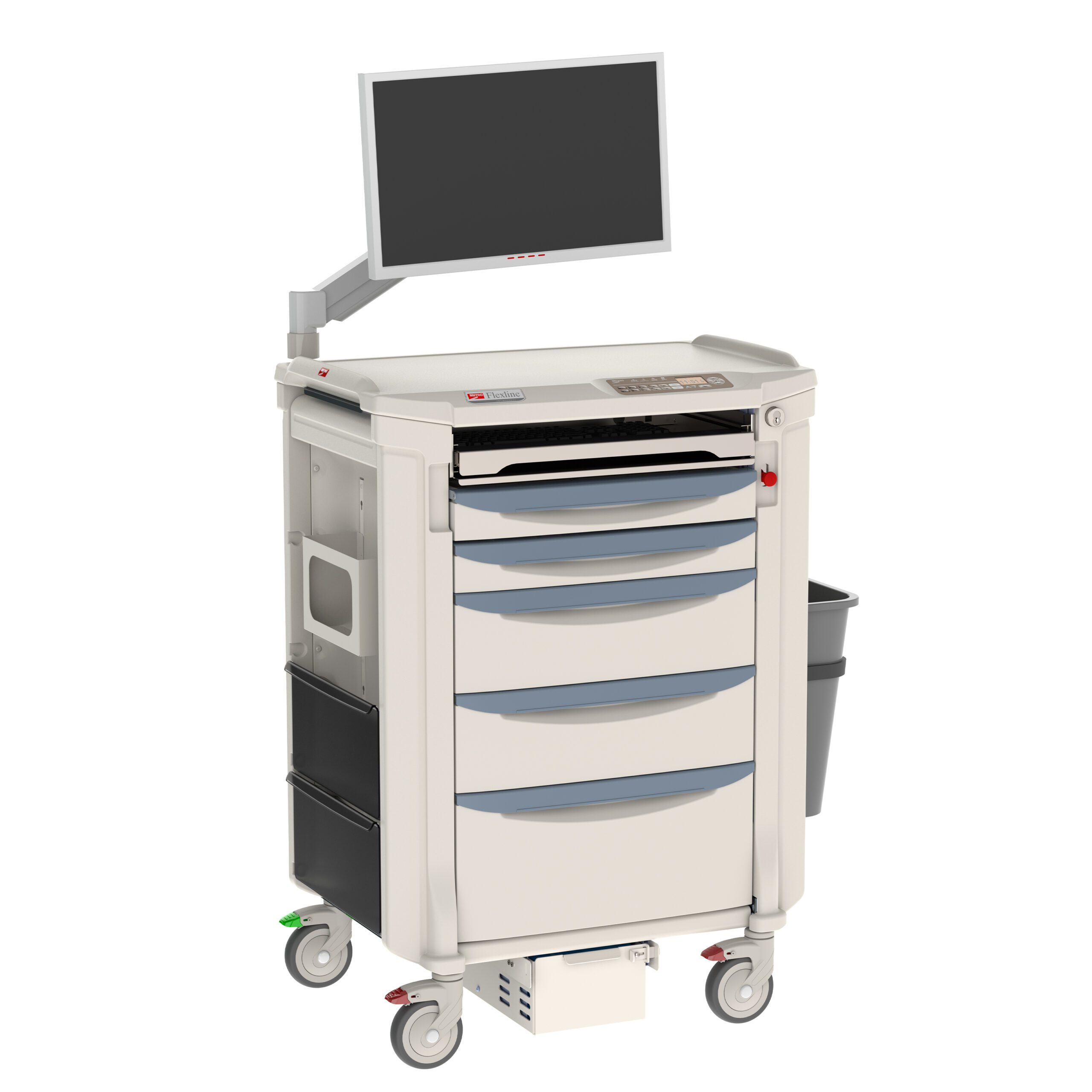 - Comprehensive Accessory Package: Includes locking and non-locking side bins, pull-out shelf, drawer divider kits, waste basket, glove box, sharps container, peel pouch container, all-in-one computer, articulating monitor arm mount, keyboard, mouse, and power pod with basic electronic touchpad.