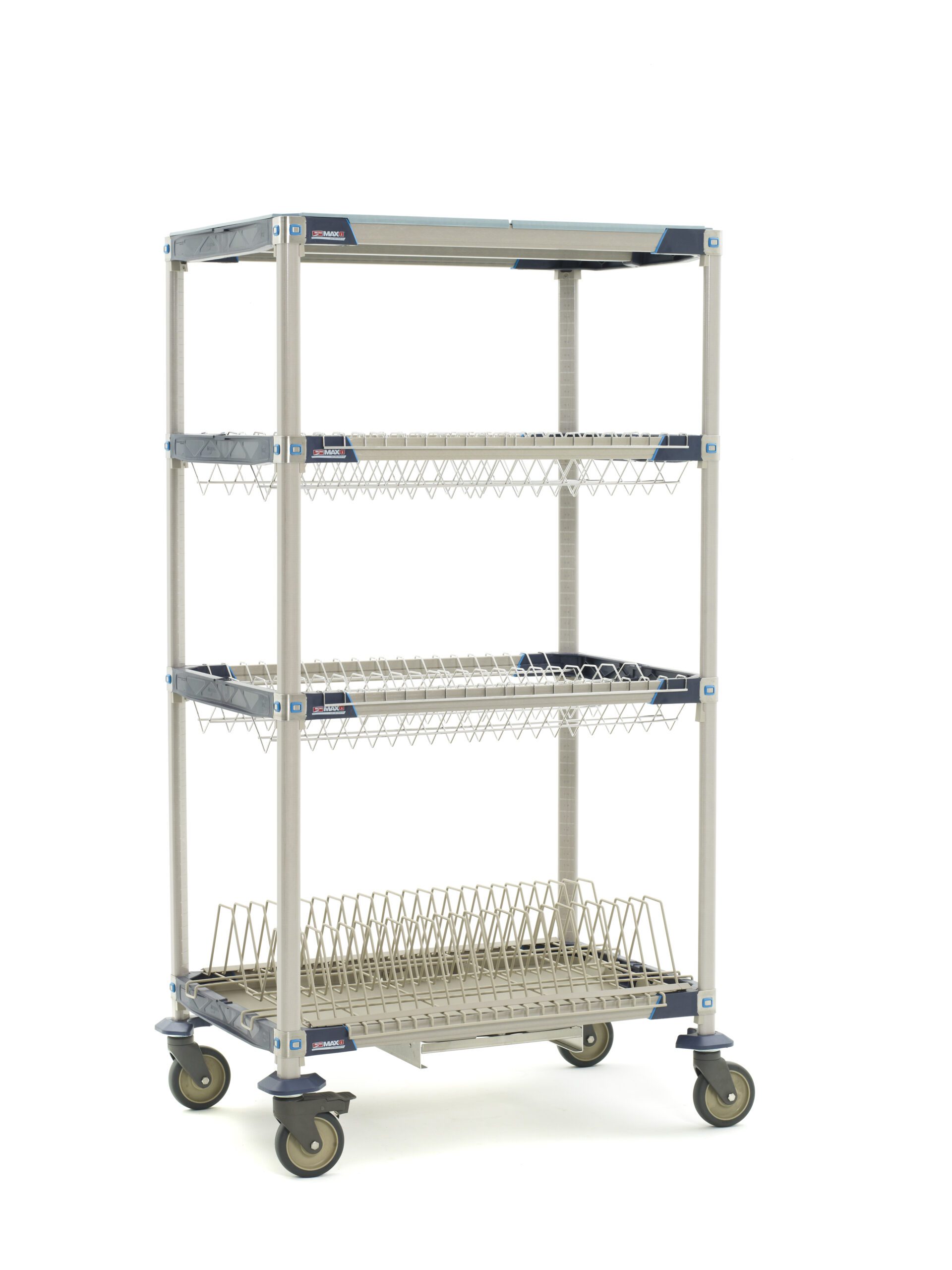 The MetroMax i PR36VX3-XDR Mobile Drying Rack, measuring 26 x 38 x 68, includes two drop-ins, one tray rack, one bulk shelf, a drip tray, and rolls smoothly on four caster wheels with gray and blue accents.