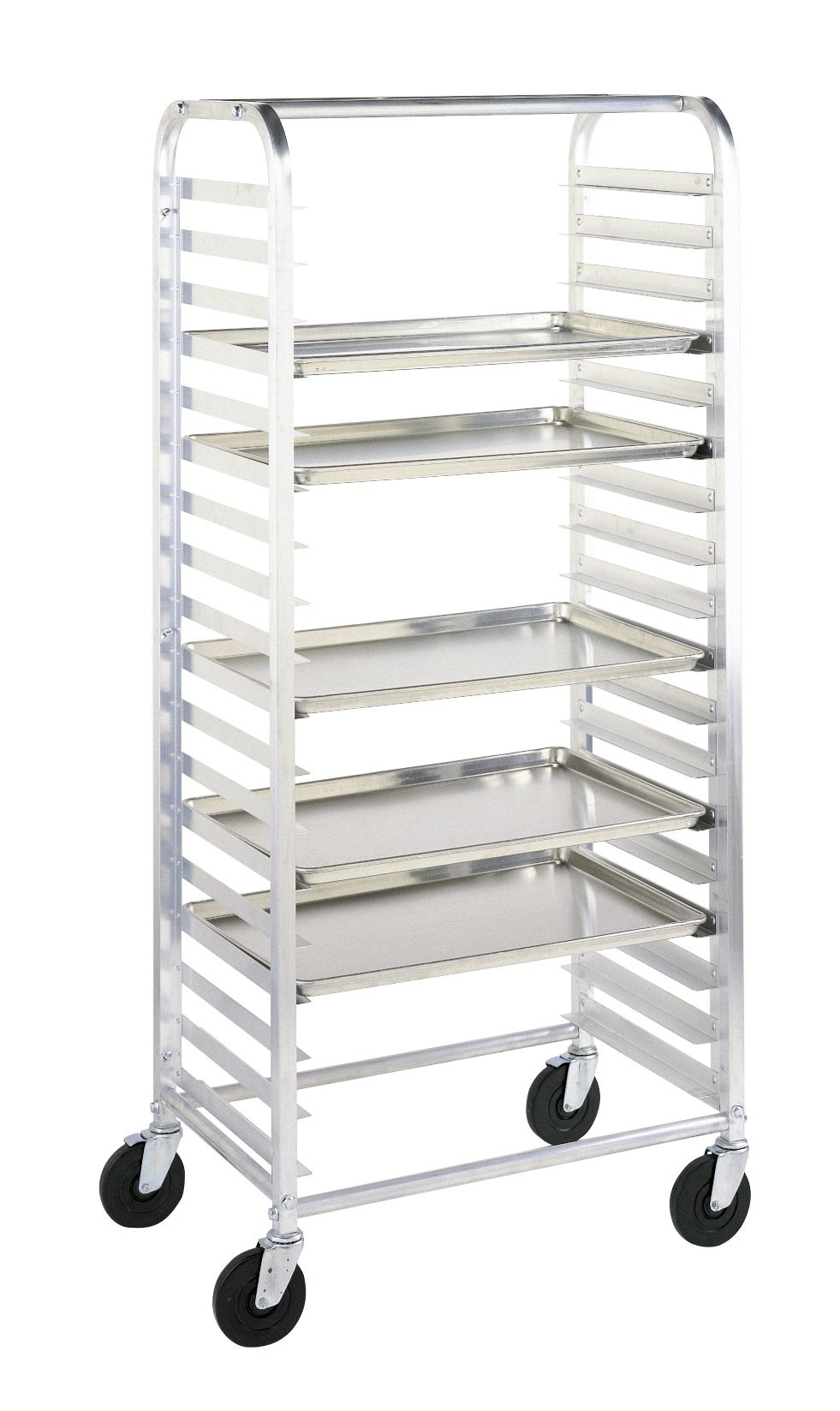 A: This rack can hold up to 11 standard 18″ x 26″ sheet pans.