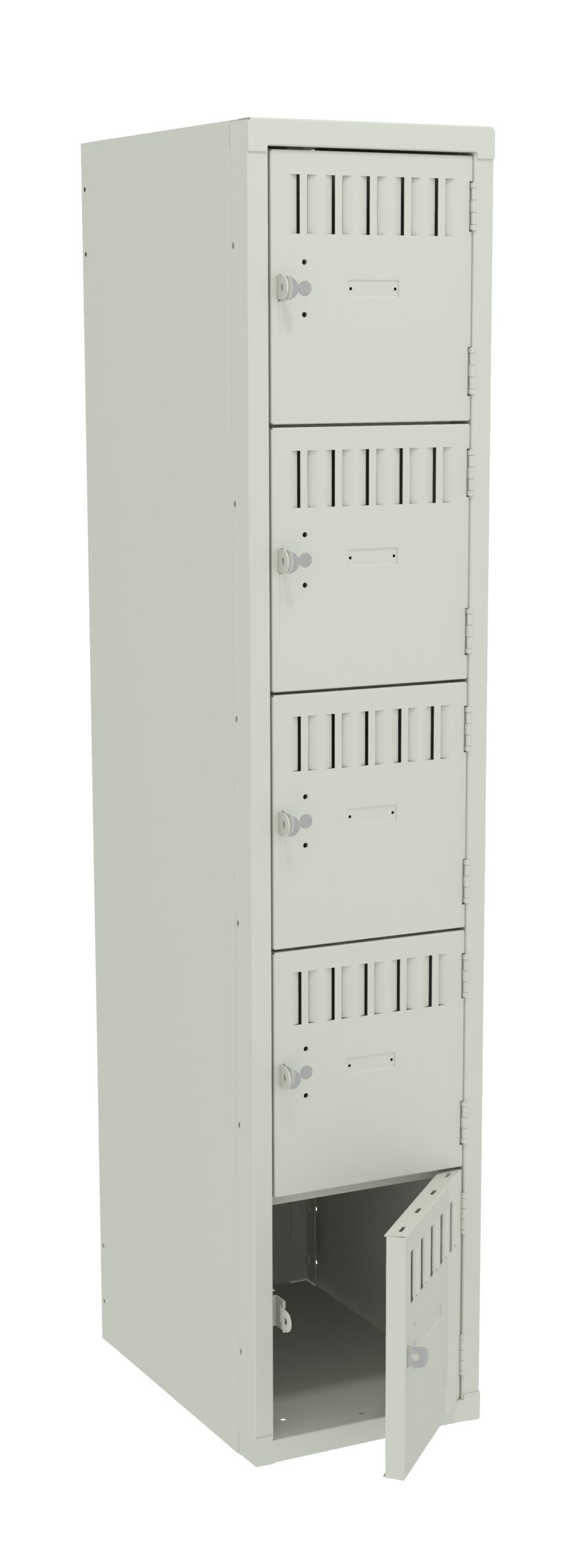 Box Lockers are ideal for securely storing smaller items like purses, lunches, books, and athletic gear. Rugged padlock hasps for added security. Welded door frame is constructed of 16-gauge steel for added rigidity. Steel locking bar offers strength, while spring actuated latches provide secure and quiet latch operation. Extra-strong five-knuckle hinge with secured pin offers added content protection and long-life. Flush louvers provide ventilation.