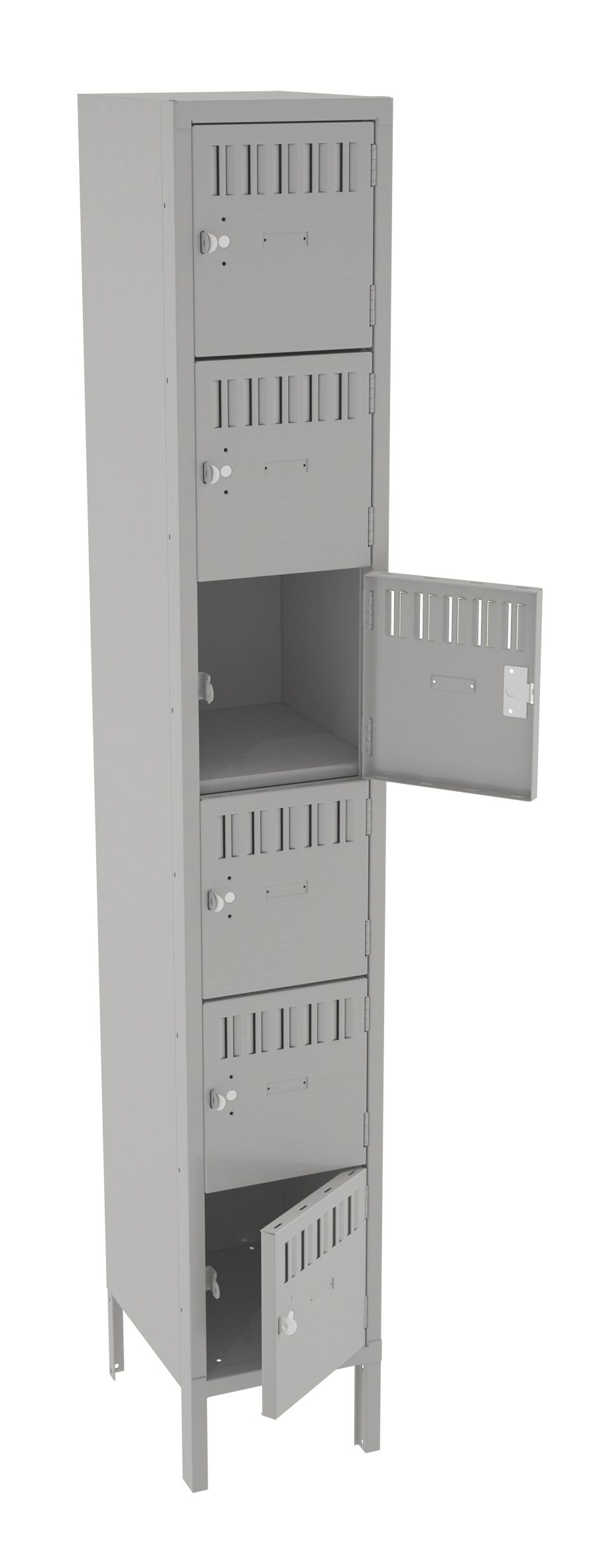 Box Lockers are ideal for securely storing smaller items like purses, lunches, books, and athletic gear. Rugged padlock hasps for added security. Welded door frame is constructed of 16-gauge steel for added rigidity. Steel locking bar offers strength, while spring actuated latches provide secure and quiet latch operation. Extra-strong five-knuckle hinge with secured pin offers added content protection and long-life. Flush louvers provide ventilation.