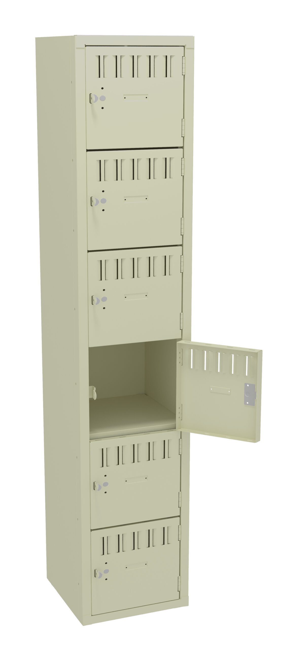 Box Lockers are ideal for securely storing smaller items like purses, lunches, books, and athletic gear. Rugged padlock hasps for added security. Welded door frame is constructed of 16-gauge steel for added rigidity. Steel locking bar offers strength, while spring actuated latches provide secure and quiet latch operation. Extra-strong five-knuckle hinge with secured pin offers added content protection and long-life. Flush louvers provide ventilation.