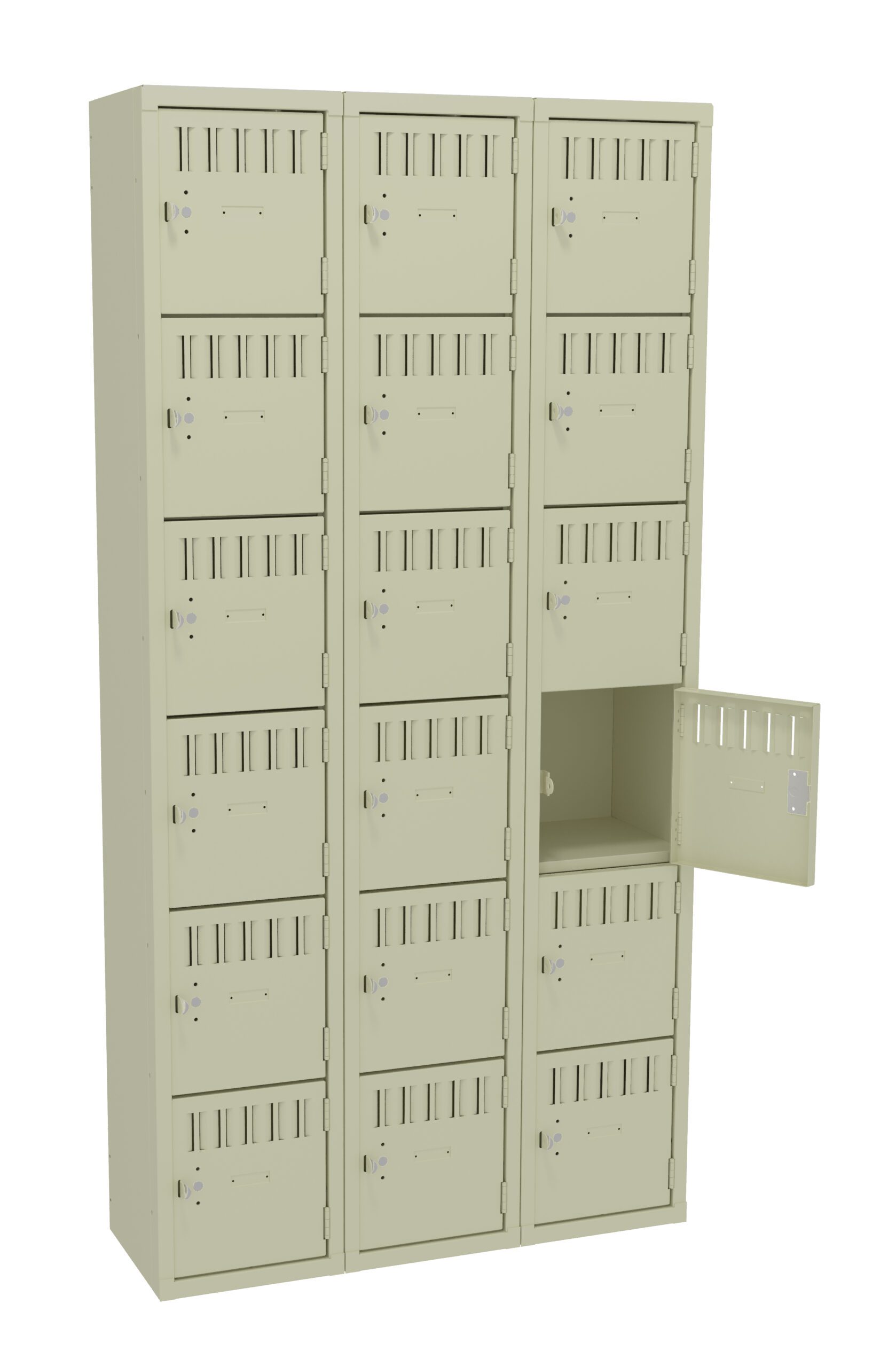 Tennsco 36″ W x 12″D Three-Wide Assembled Six-Tier Box Locker without Legs, Champagne/Putty