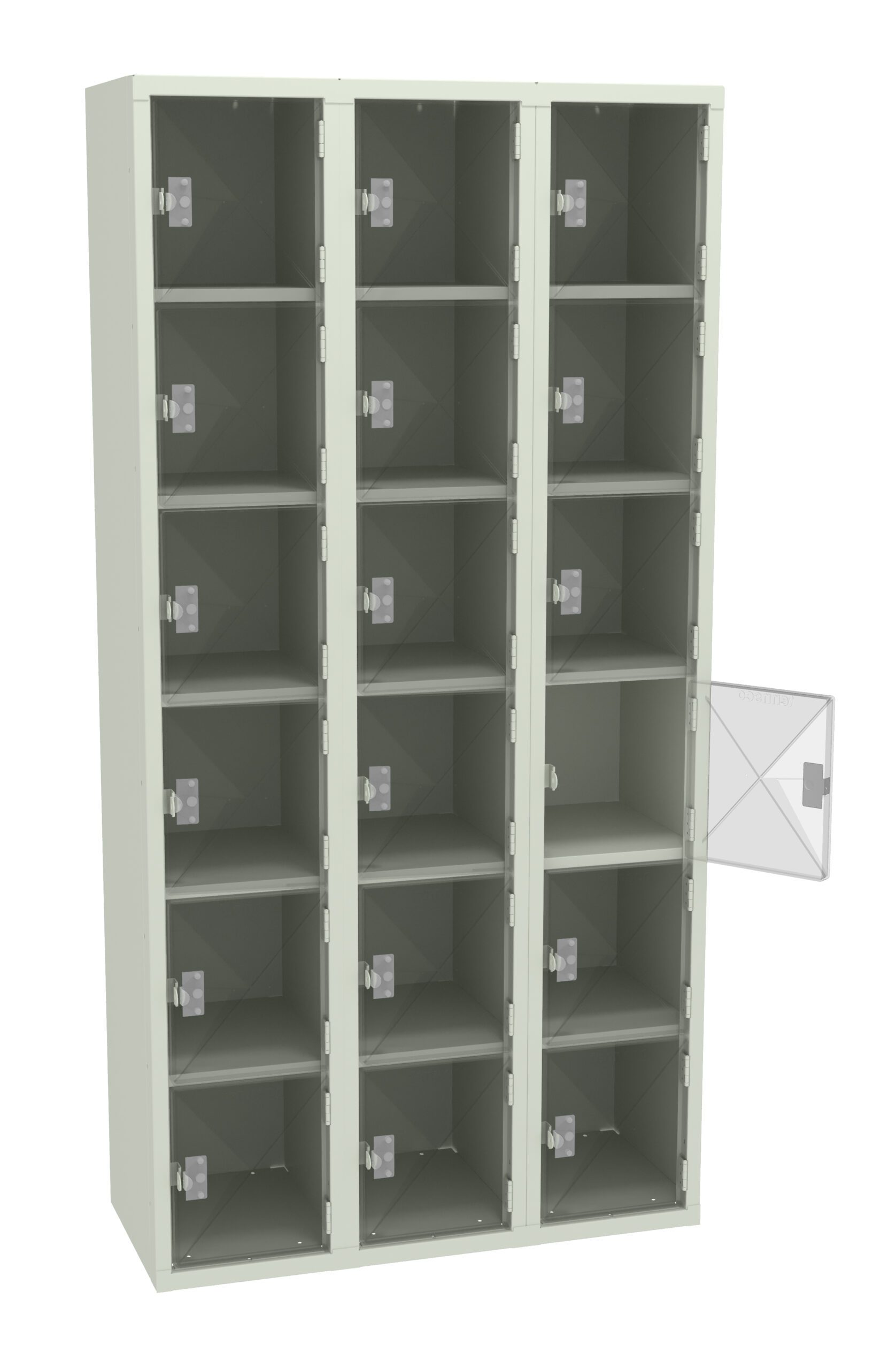 Tennsco 36″ W x 15″D Three-Wide Assembled Six-Tier C-Thru Box Locker Without Legs, Light Grey