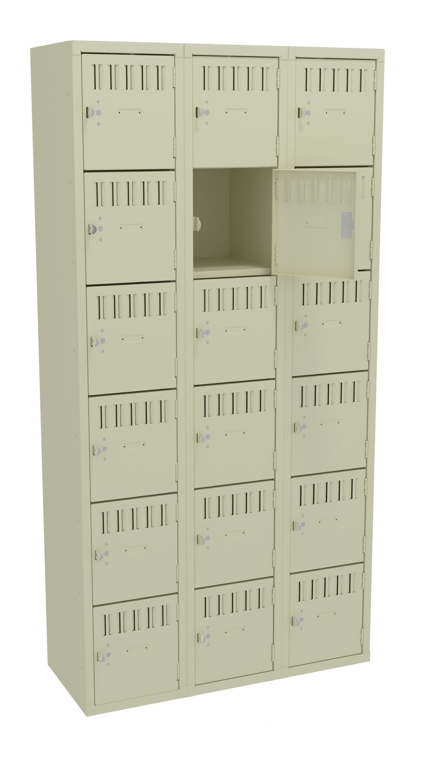 Box Lockers are ideal for securely storing smaller items like purses, lunches, books, and athletic gear. Rugged padlock hasps for added security. Welded door frame is constructed of 16-gauge steel for added rigidity. Steel locking bar offers strength, while spring actuated latches provide secure and quiet latch operation. Extra-strong five-knuckle hinge with secured pin offers added content protection and long-life. Flush louvers provide ventilation.