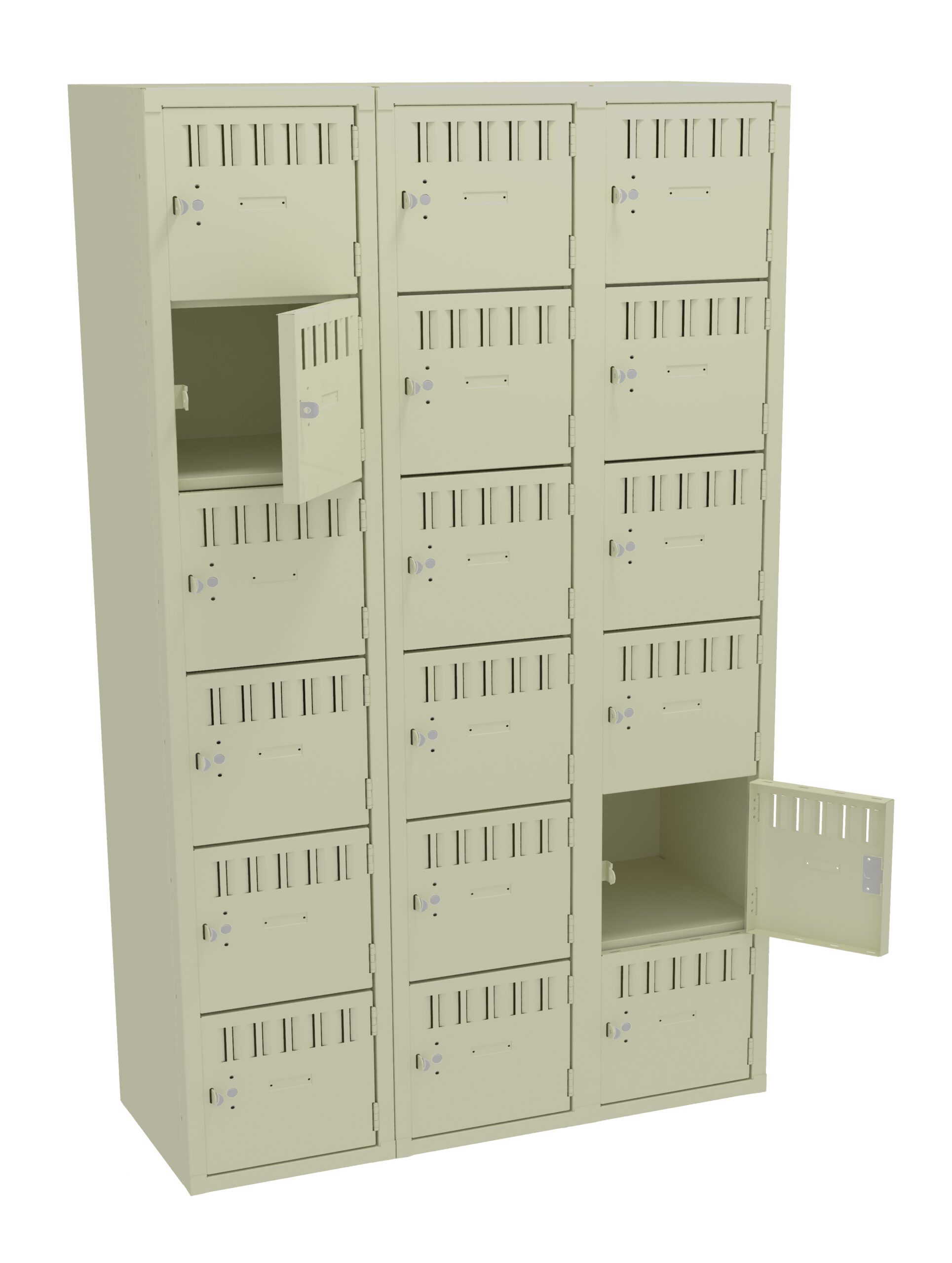 Tennsco 45″ W x 18″D Three-Wide Unassembled Six-Tier Box Locker without Legs, Champagne/Putty