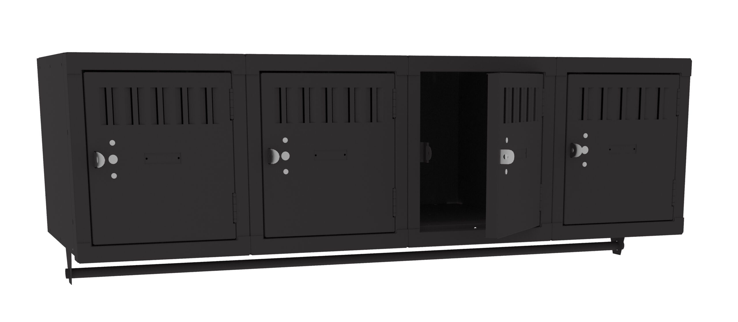 Four Person Wall Mounted Locker is ideal when floor space is limited. Rugged padlock hasps for added security. Flush louvers for ventilation. Coat rod included – 47 7/8″.