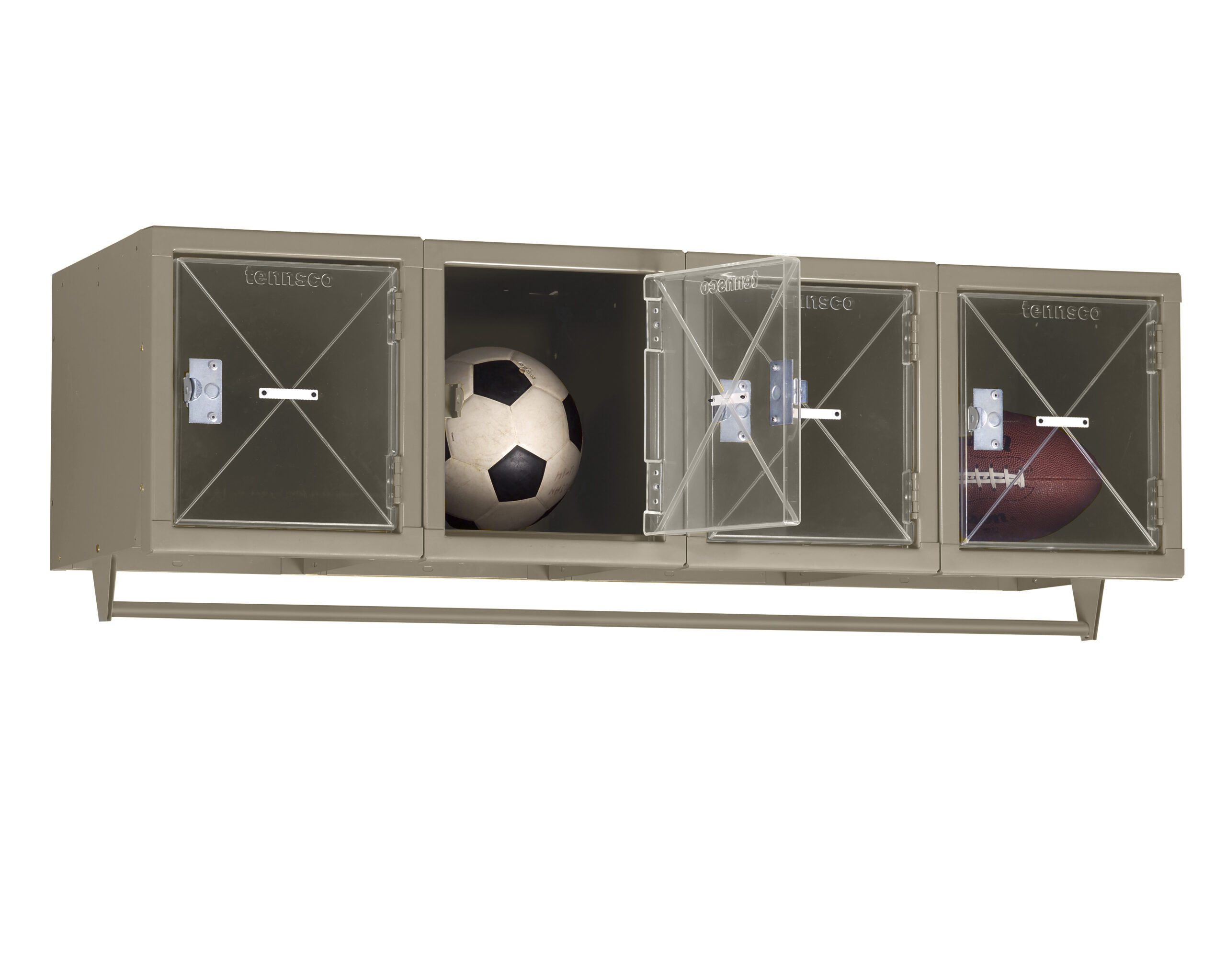 Clear yet strong acrylic doors offer visibility of locker contents for security reasons. Four Person Wall Mounted Locker is ideal when floor space is limited. Rugged padlock hasps for added security. Flush louvers for ventilation. Coat rod included – 47 7/8″.