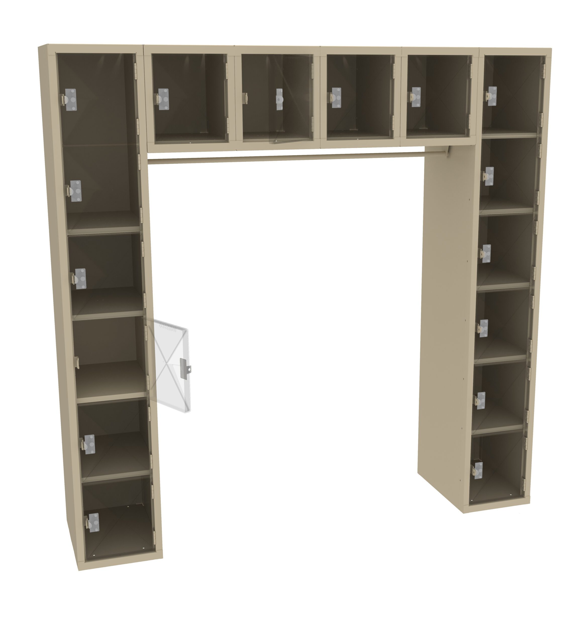 Get all the benefits of economical Box Lockers plus the advantage of hanging space for full length garments. Clear yet strong acrylic doors offer visibility of locker contents for security reasons. Secure acrylic door panels are positioned in steel channels and riveted to maintain the door’s integrity. Welded door frame is constructed of 16-gauge steel for added rigidity. Steel locking bar offers strength, while spring actuated latches provide secure and quiet latch operation. Extra-strong five-knuckle hinge with secured pin offers added content protection and long-life.