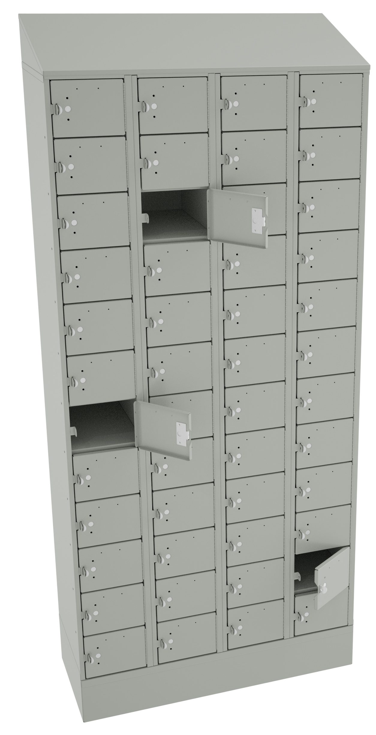 Locker ships fully assembled. Sloping top prevents accumulation of clutter. Doors accept standard padlocks with up to a 9/32” diameter shackle. Doors accept Tennsco number/name plates.
