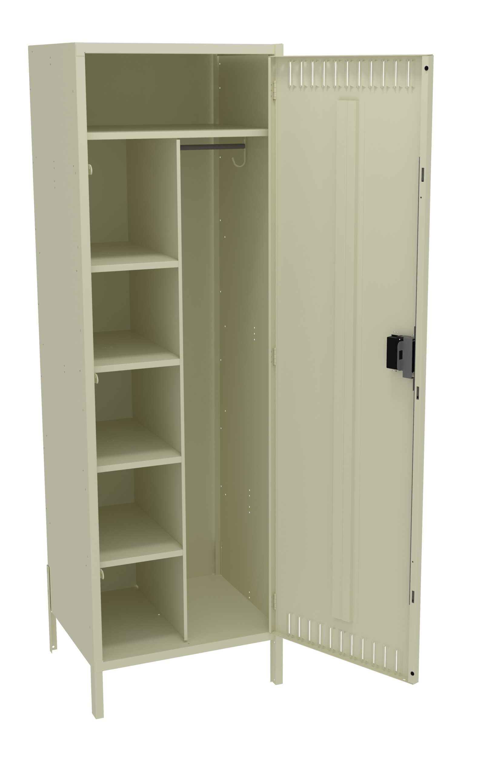 Open beige metal storage locker with four shelves on the left and a long compartment on the right equipped with a hanging rod. The locker door is open, revealing the interior, with a ventilation panel on the right door.