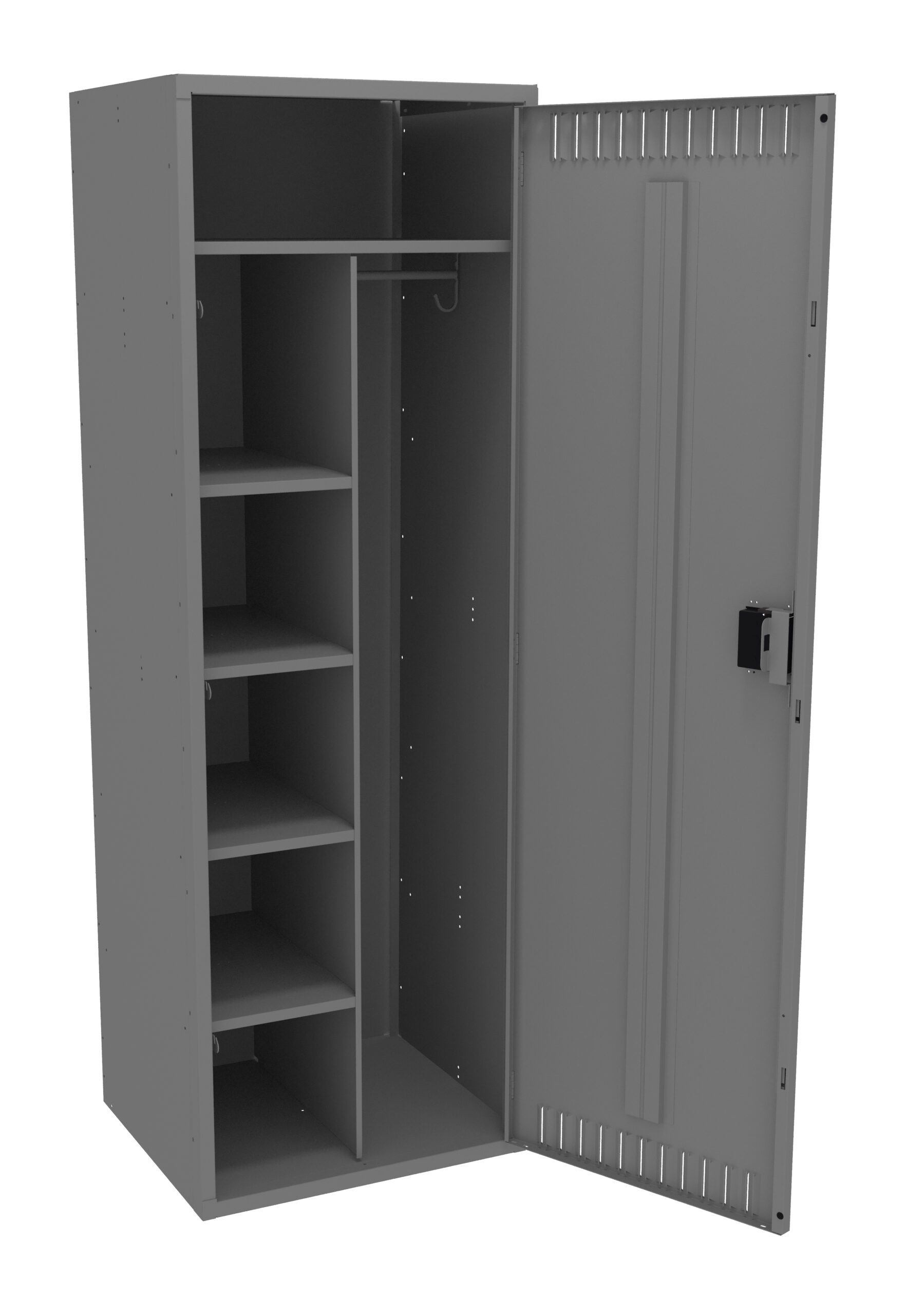 Deluxe, multi-purpose Combination Locker features a full width top shelf, five individual storage compartments and room for full length hanging garments. Door stiffeners for added rigidity. Positive 3 point locking system on doors. Flush louvers for ventilation. Lockers are welded and ready-to-use.