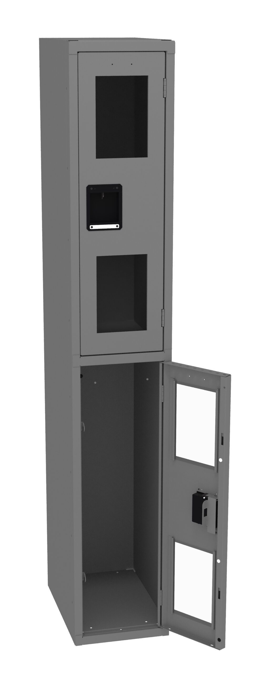 Double Tier Lockers offer an advantage in that twice the number of lockers can be placed in the same space as single tier lockers. Clear yet strong acrylic doors offer visibility of locker contents for security reasons. Secure acrylic door panels are positioned in steel channels and riveted to maintain the door’s integrity. Welded door frame is constructed of 16-gauge steel for added rigidity. Steel locking bar offers strength, while spring actuated latches provide secure and quiet latch operation. Extra-strong five-knuckle hinge with secured pin offers added content protection and long-life. Recessed handle design on steel doors with visual door panels is vandal-resistant.