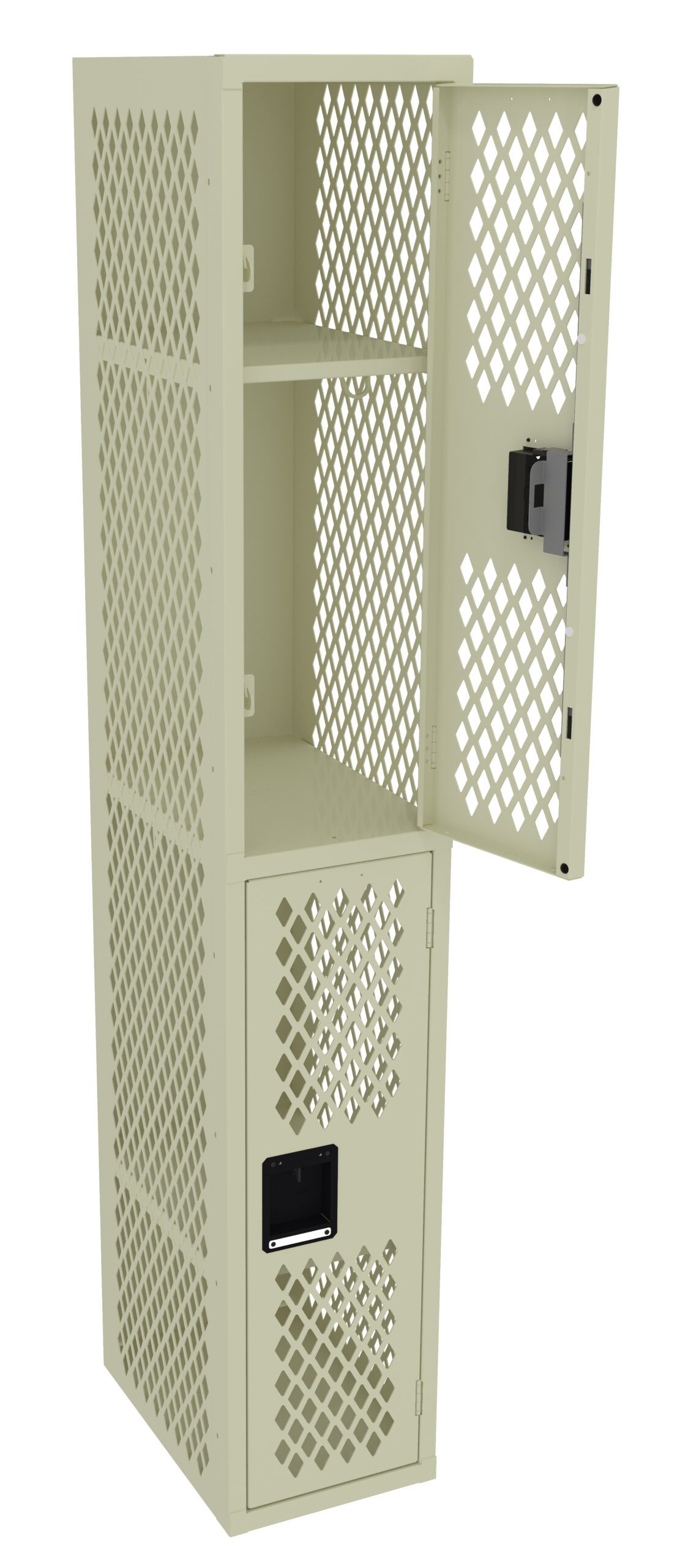 Perforated locker body ensures continuous airflow for maximum ventilation of clothing, etc. while providing complete visibility to contents. Double Tier lockers feature two openings per locker, giving you twice as many lockers in the same space as a single tier locker. Three coat hooks per opening. Positive 3 point locking system on doors.
