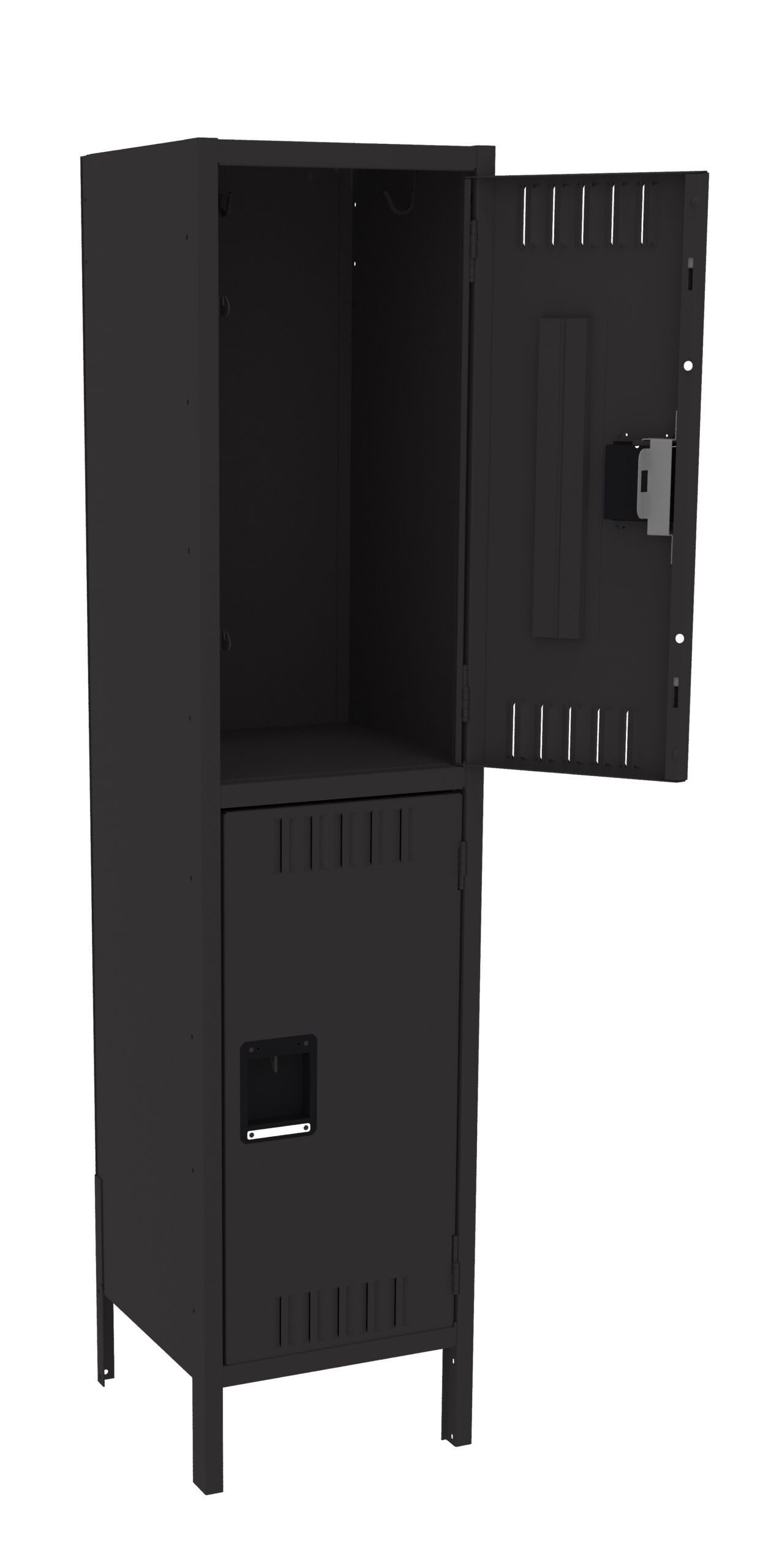Double Tier lockers feature two openings per locker, giving you twice as many lockers in the same space as a single tier locker. Three coat hooks per opening. Positive 2 point locking system on doors. Flush louvers for ventilation. Door stiffeners add rigidity.