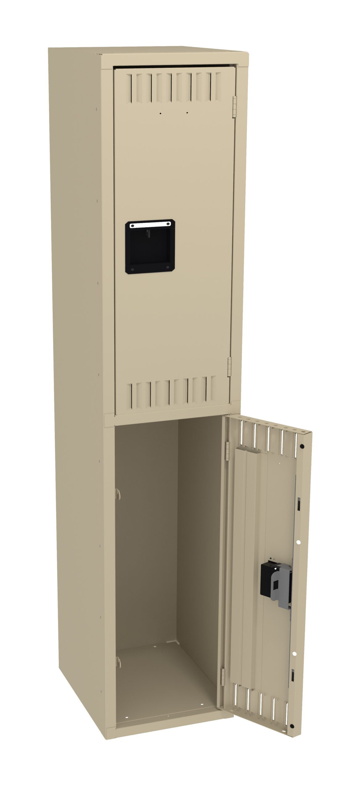 Double Tier lockers feature two openings per locker, giving you twice as many lockers in the same space as a single tier locker. Three coat hooks per opening. Positive 2 point locking system on doors. Flush louvers for ventilation. Door stiffeners add rigidity.