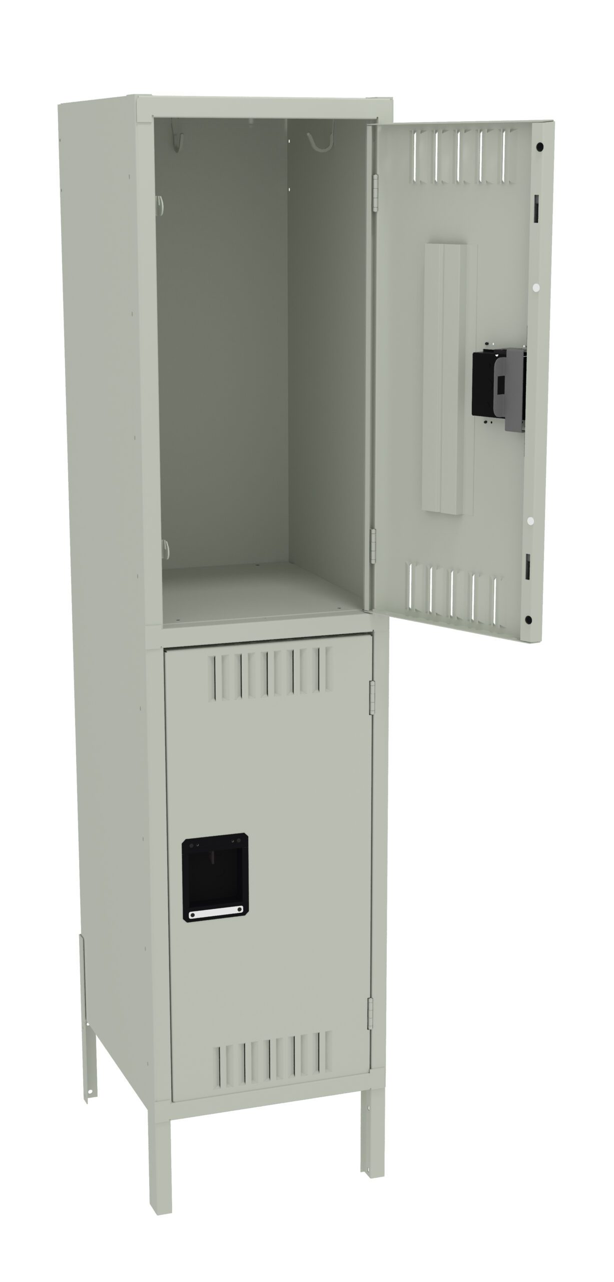 Double Tier lockers feature two openings per locker, giving you twice as many lockers in the same space as a single tier locker. Three coat hooks per opening. Positive 2 point locking system on doors. Flush louvers for ventilation. Door stiffeners add rigidity.