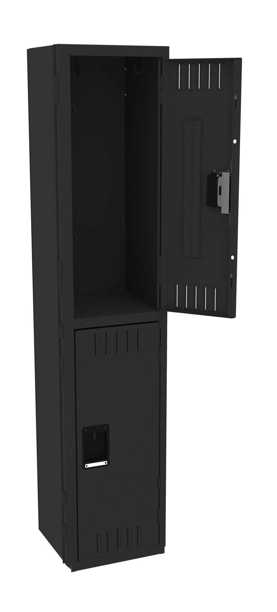 Double Tier lockers feature two openings per locker, giving you twice as many lockers in the same space as a single tier locker. Three coat hooks per opening. Positive 2 point locking system on doors. Flush louvers for ventilation. Door stiffeners add rigidity.