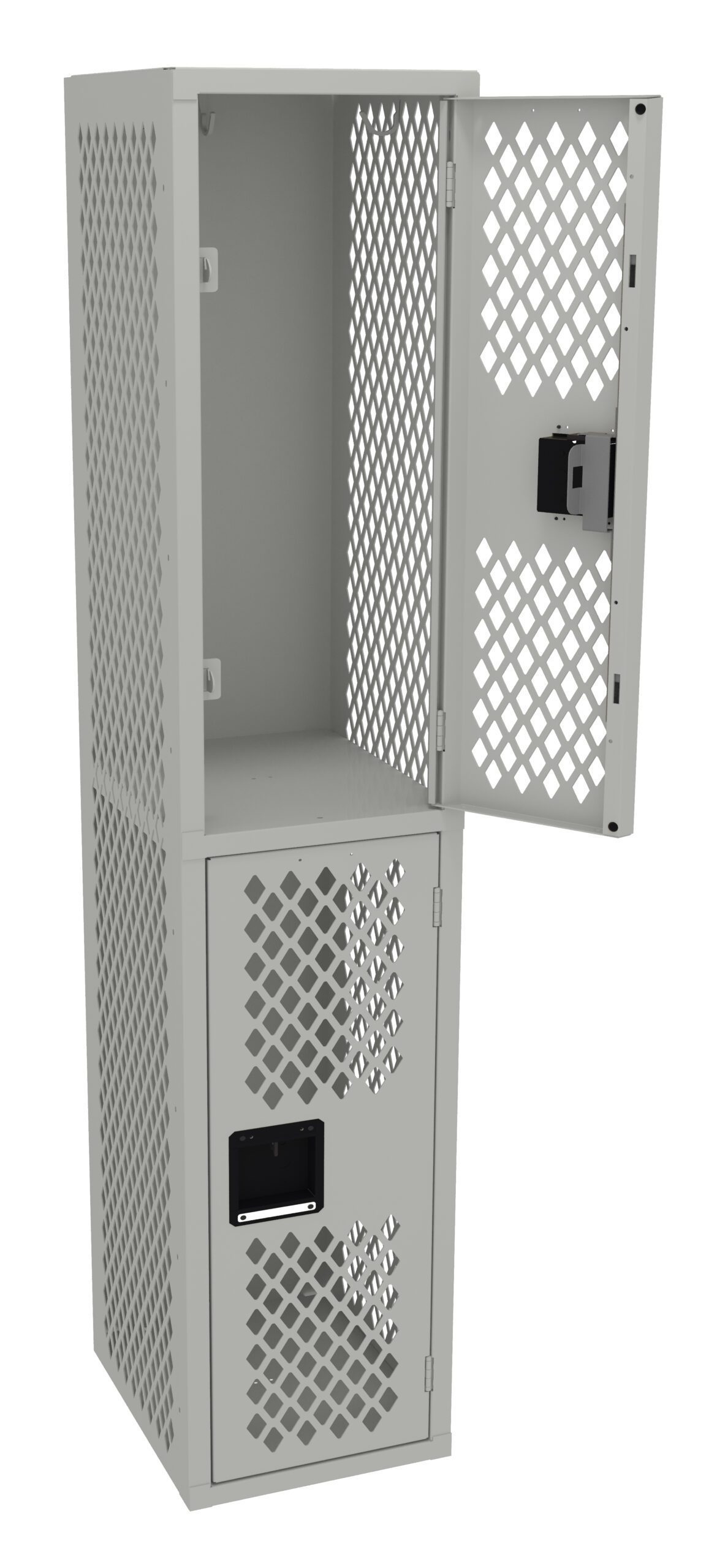 Perforated locker body ensures continuous airflow for maximum ventilation of clothing, etc. while providing complete visibility to contents. Double Tier lockers feature two openings per locker, giving you twice as many lockers in the same space as a single tier locker. Three coat hooks per opening. Positive 3 point locking system on doors.