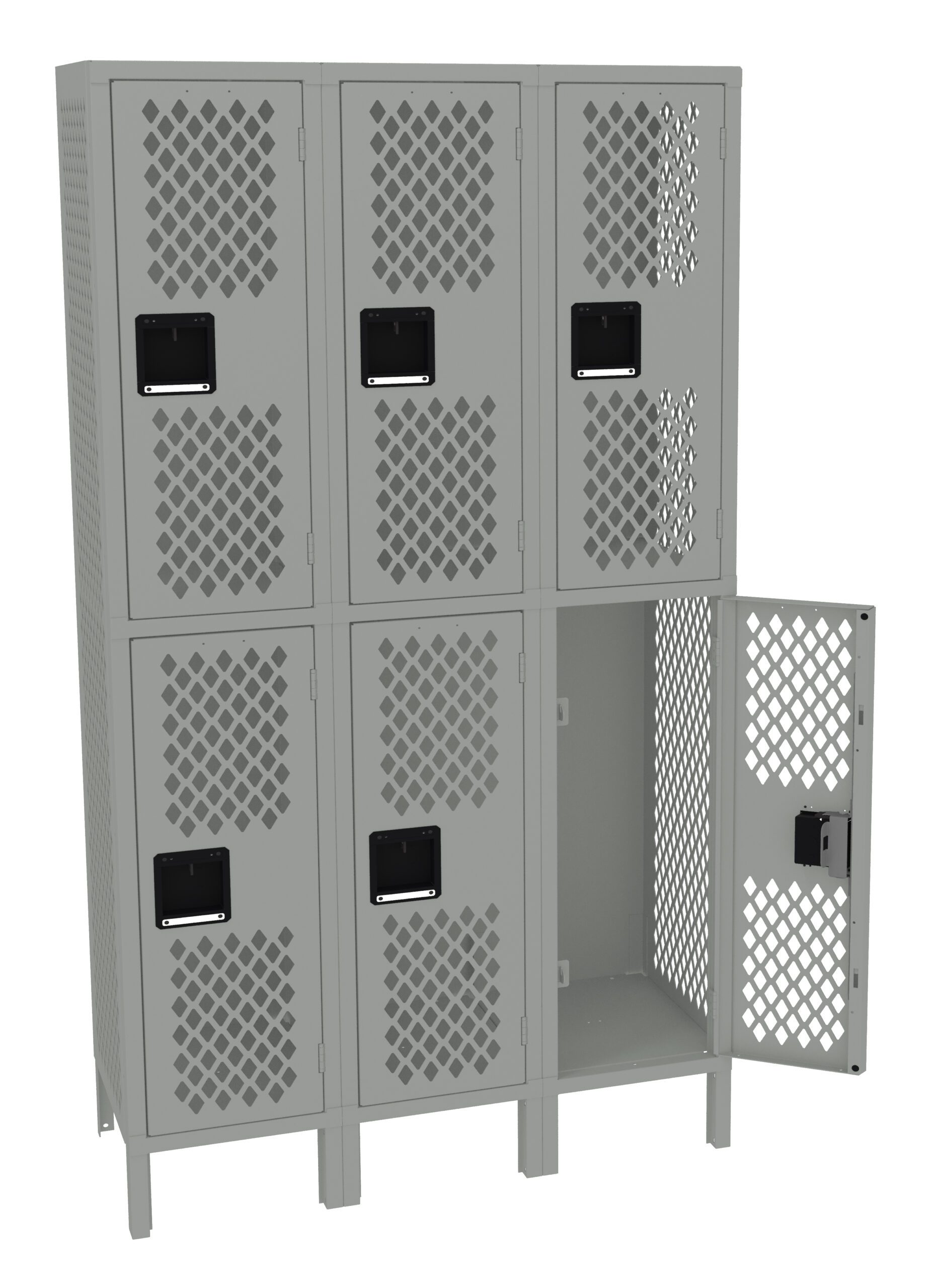 Perforated locker body ensures continuous airflow for maximum ventilation of clothing, etc. while providing complete visibility to contents. Double Tier lockers feature two openings per locker, giving you twice as many lockers in the same space as a single tier locker. Three coat hooks per opening. Positive 3 point locking system on doors.